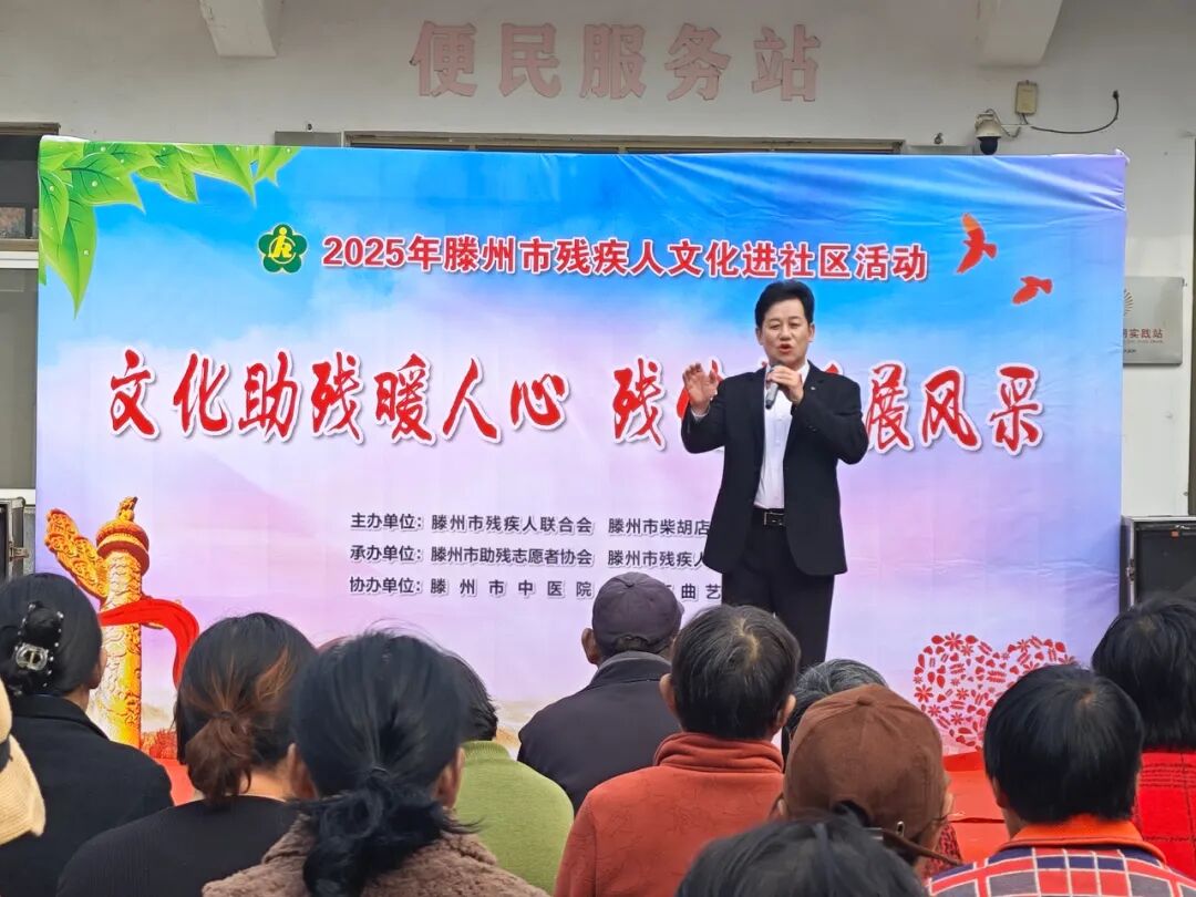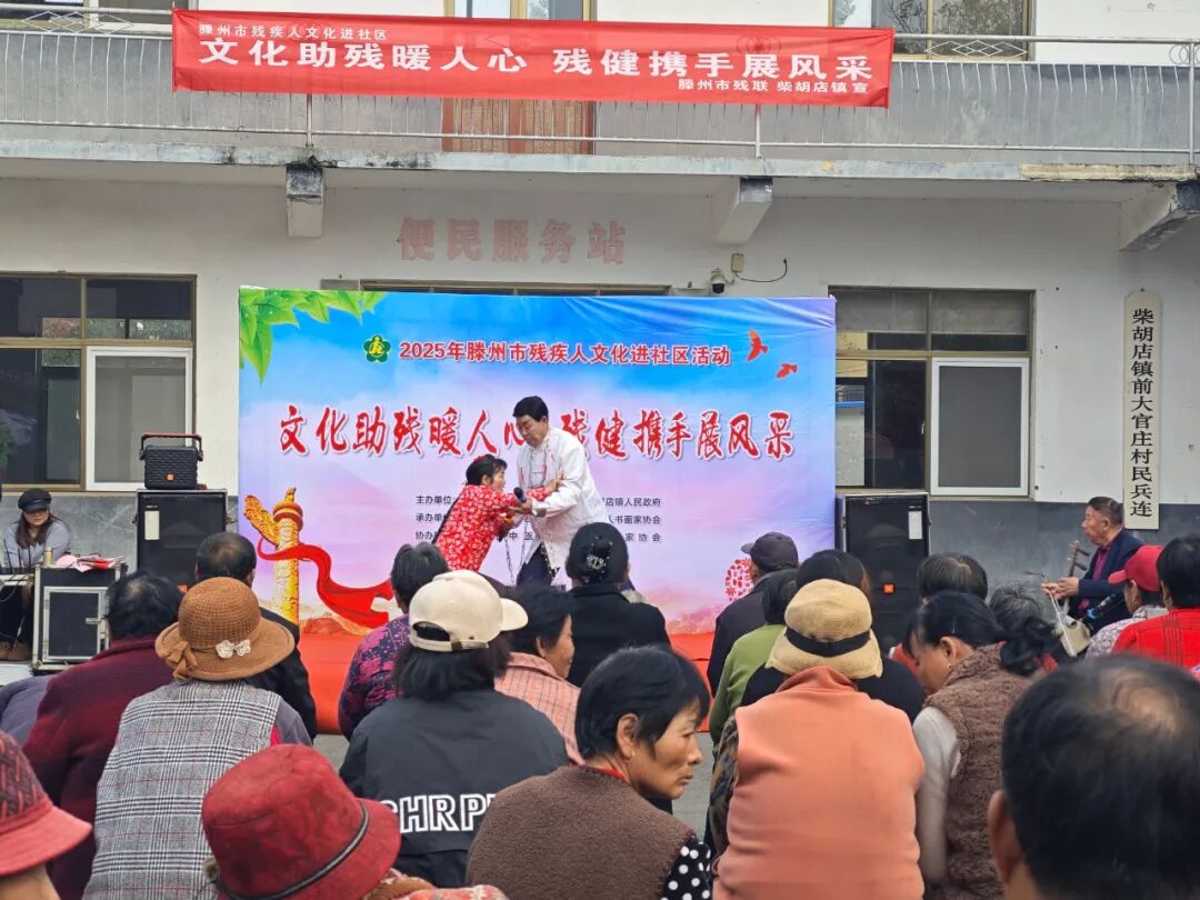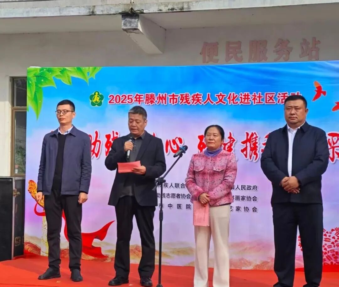 为深入贯彻党的二十大精神,以高质量文化供给丰富残疾人精神文化生活,推动扶残助残社会风尚,10 月 30 日由滕州市残联联合柴胡店镇人民政府主办的“文化助残暖人心 残健携手展风采” 残疾人文化进社区活动,在柴胡店镇前大官庄社区温情启幕。活动由滕州市助残志愿者协会、残疾人书画家协会承办,市中医院、曲艺家协会协办,为基层残疾人带来了一场集文化体验与健康服务于一体的便民盛宴。