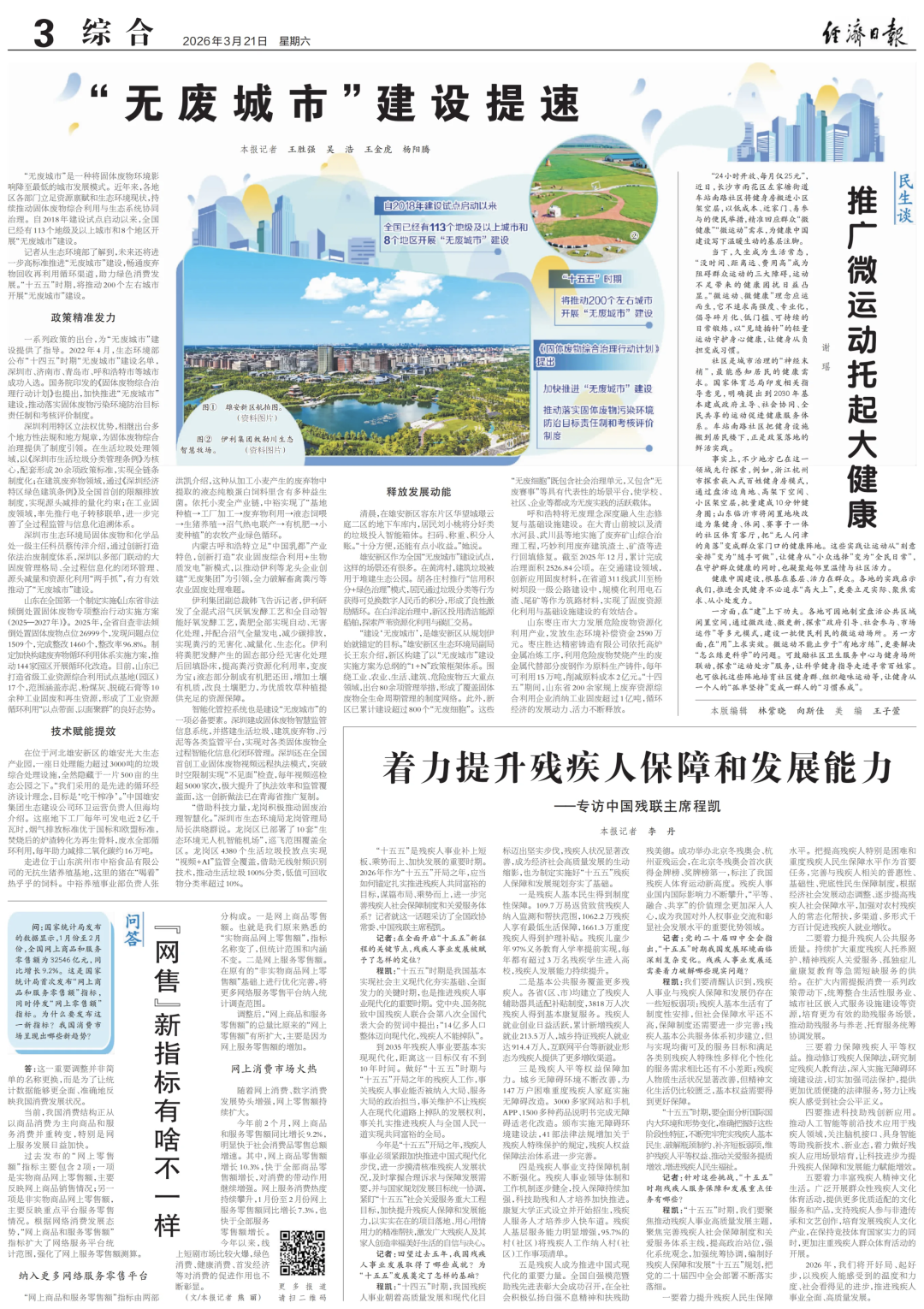 一是残疾人基本民生得到制度性保障。109.7万易返贫致贫残疾人纳入监测和帮扶范围,1062.2万残疾人享有最低生活保障,1661.3万重度残疾人得到护理补贴。残疾儿童少年97%义务教育入学率提前实现,每年都有超过3万名残疾学生进入高校,残疾人发展能力持续提升。