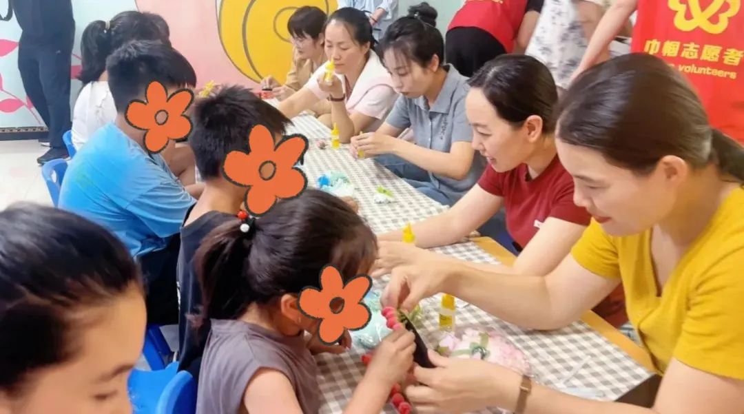 第二环节的簪花非遗文化体验活动同样温馨热闹。巾帼志愿者详细介绍了簪花的历史渊源与文化内涵,现场展示了传统簪花的制作步骤与技巧。随后,爱心妈妈与结对儿童两两一组,协作完成簪花制作。选材、上胶、定型……大家边学边做,一件件精美的簪花作品逐渐成形,爱心妈妈们小心翼翼地将亲手制作的簪花为结对儿童佩戴,并合影留念。