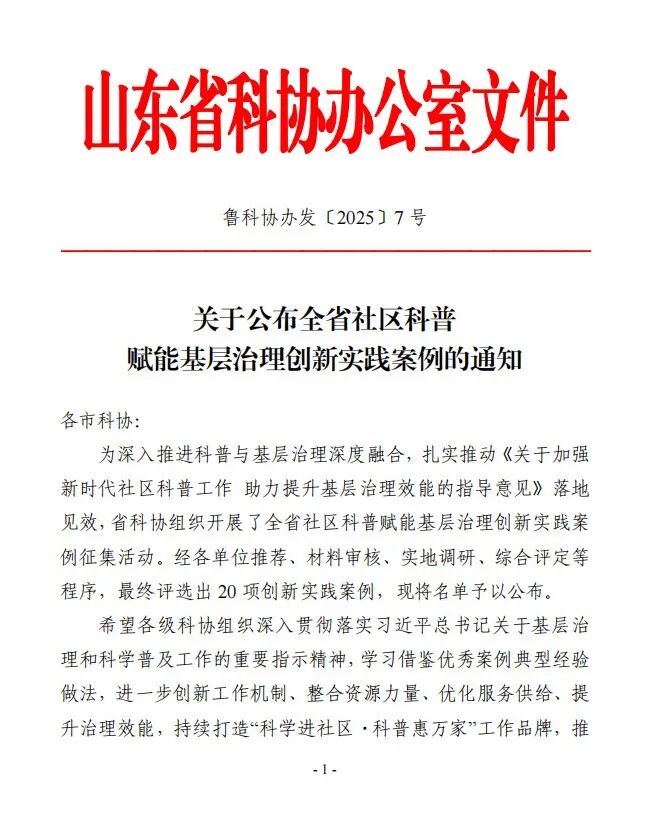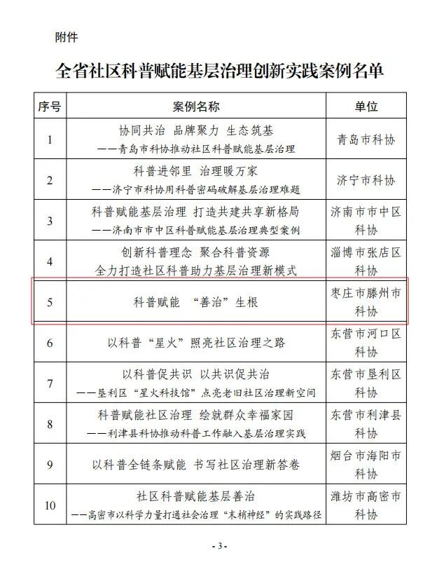 近日,省科协公布全省社区科普赋能基层治理创新实践案例评选结果,滕州市科协提报的《科普赋能,“善治”生根》成功入选,成为全省20项创新实践案例之一。