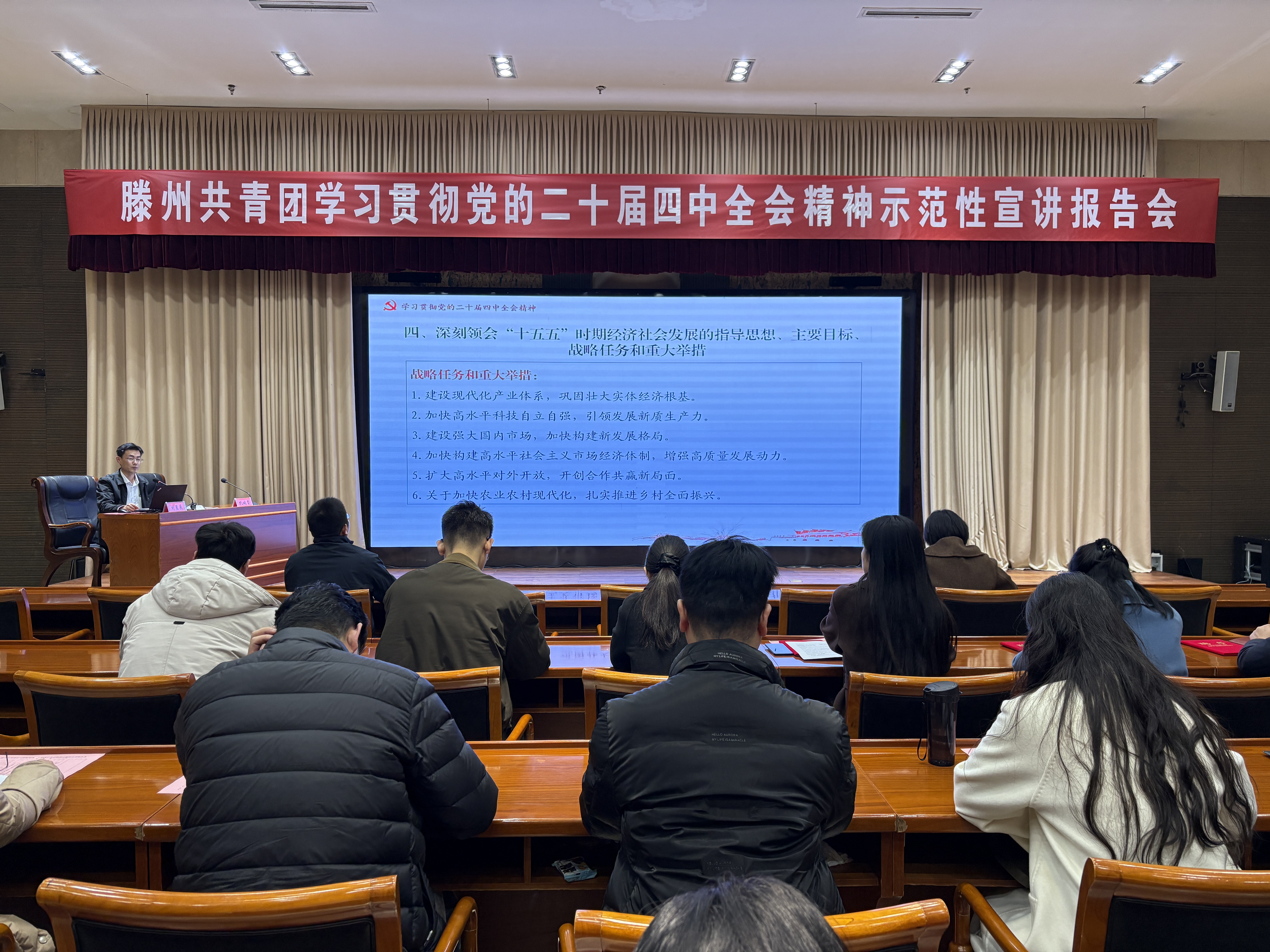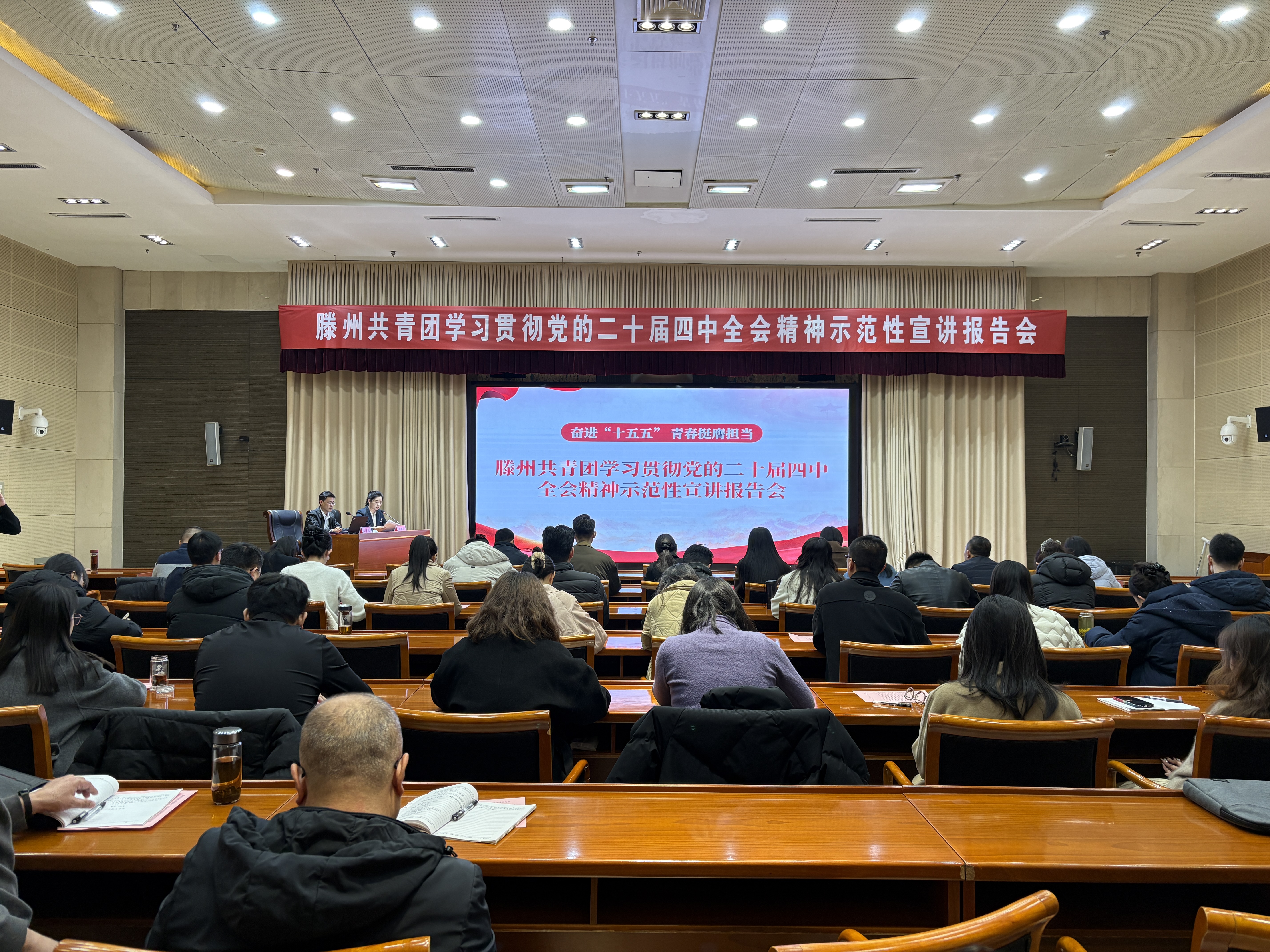 为深入学习领会、全面准确把握党的二十届四中全会精神,切实把全市各级团组织、广大团员青年的思想和行动统一到全会精神上来,团结带领广大青年奋进“十五五”、建功新征程,12月19日,滕州共青团学习贯彻党的二十届四中全会精神示范性宣讲报告会举行。滕州团市委全体人员、镇(街)团(工)委书记、市直单位团委书记参加会议。