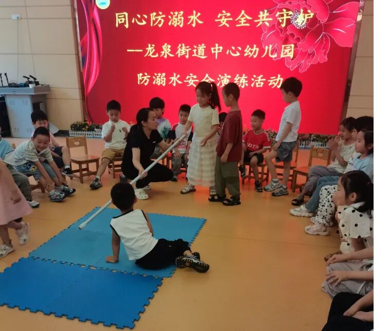 讲解员反复强调 “禁止幼儿私自下水营救” 的核心原则,现场演示遇到他人溺水时的正确处置流程: