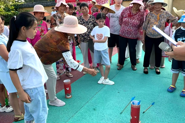 随着比赛哨声响起,赛场瞬间成为欢乐的海洋。在踢毽子区域,选手们脚尖轻点,毽子如灵动的蝴蝶上下翻飞;跳绳赛场上,参赛者身轻如燕,绳影翻飞间尽显矫健身姿;投壶区则弥漫着紧张与期待,每一次精准投掷都伴随着观众席的欢呼喝彩。参赛村民精神抖擞、斗志昂扬,充分发扬“友谊第一、比赛第二”的体育精神,赛出了不服输的劲头,更赛出了邻里间的友善和谐。