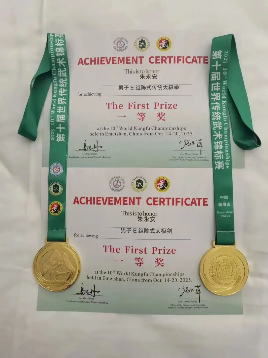 在个人项目角逐中,我市运动员朱永安动作舒展连贯、刚柔并济,最终凭借扎实的功底、精湛的技艺以高分夺得男子E组传统陈氏太极拳、陈氏太极剑两个项目金牌。谈及获奖感受,朱永安表示:“这份荣誉是对平日刻苦训练的最好回报,更离不开拳馆老师的系统训练。未来将继续深耕太极技艺,助力传统武术走向更广阔的舞台。”