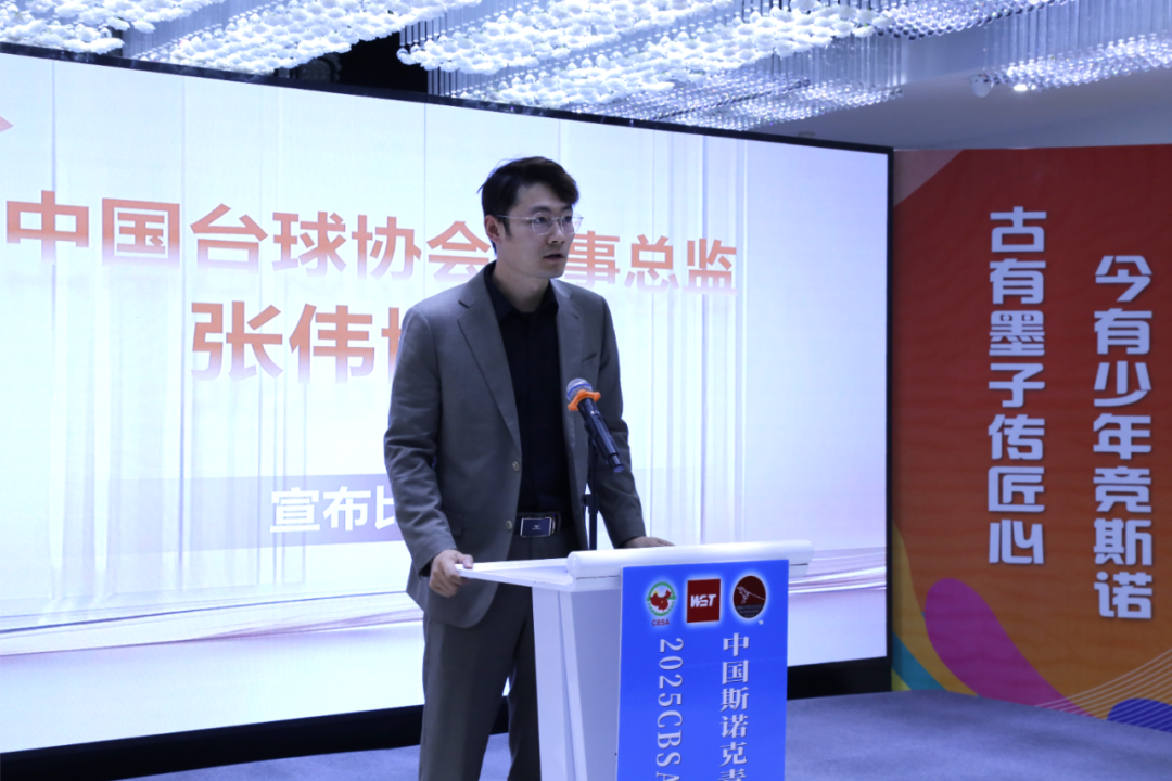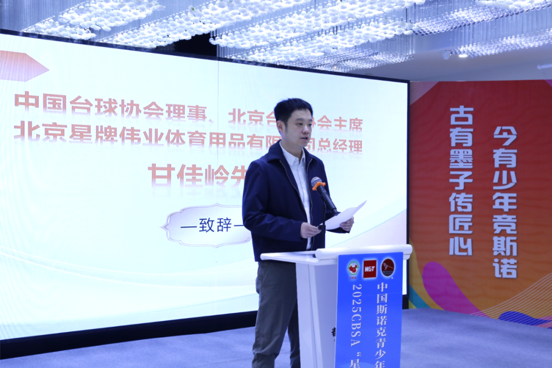 随后,中国台球协会理事、北京台球协会主席、北京星牌伟业体育用品有限公司总经理甘佳岭先生代表冠名单位及合作方致辞。他回顾了中国斯诺克运动的发展历程,肯定了青少年系列赛在发掘和培养新生代球员方面的重要作用,并对赛事的成功举办表达了美好祝愿,承诺将持续支持中国斯诺克事业的根基建设。