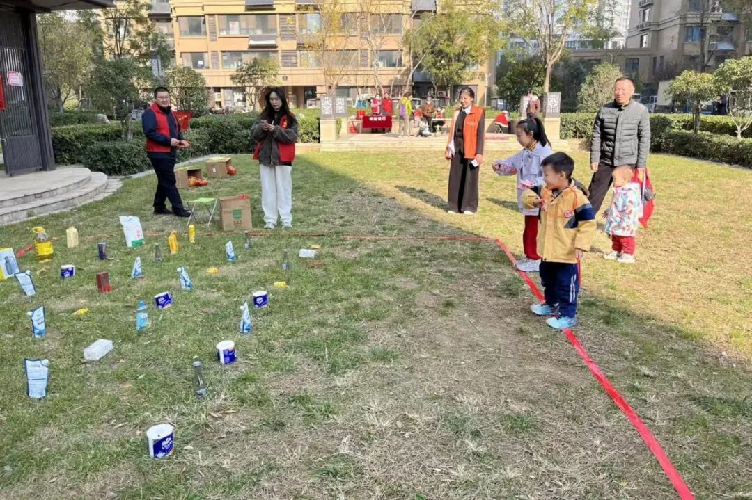 活动筹备阶段,社区工作人员提前细化流程、精心布置场地,从安全保障到道具准备逐一落实,全力为亲子家庭打造安全有序、趣味十足的活动环境。活动现场,三个特色项目轮番上演,精彩不断。“蒙眼闯关” 环节中,孩子们蒙上双眼,在家长的轻声指引下努力保持平衡,蹒跚的步伐、谨慎的探索引得现场阵阵欢笑,既锻炼了孩子的信任感,也拉近了亲子距离;“赶鸡入笼财运到” 项目趣味盎然,孩子们手持小扇子,屏气凝神地赶着 “公鸡” 向目标笼中移动,专注的神情、笨拙又认真的动作让人忍俊不禁,现场洋溢着童真童趣;“欢乐套圈” 更是人气爆棚,孩子们站在指定线外,手握彩圈屏息凝神,瞄准心仪的奖品奋力一掷,或是巧用技巧调整力度,每一次成功套中都伴随着欢呼雀跃。社区志愿者全程暖心守护在旁,不仅细致维持现场秩序,还耐心为孩子们讲解投掷技巧,保障活动安全顺畅开展。