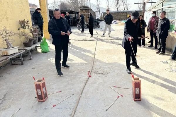 运动会设置了拔河、跳绳、踢毽子和投壶四项趣味项目,兼顾竞技性与娱乐性,适合各年龄段村民参与。拔河比赛作为团体项目,瞬间点燃现场激情。村民们分成两队,紧握绳索,奋力拼搏。围观群众呐喊助威,加油声此起彼伏;跳绳环节,村民们轻盈跳跃,动作敏捷,展现了良好的身体协调性和耐力,五彩毽子在空中翻飞,村民们用脚内侧、外侧巧妙控制,比拼技巧和耐力,参与者乐在其中,仿佛回到了童年时光;投壶比赛作为传统项目,投壶考验参与者的专注力和手眼协调。村民们手持箭矢,瞄准壶口,屏息凝神,每次成功投中都会引发阵阵欢呼,增添了运动会的文化韵味。