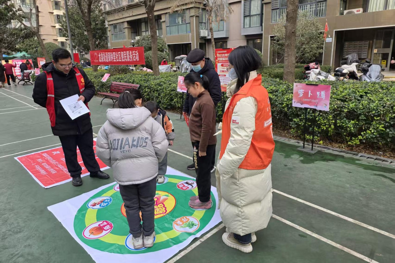 包水饺环节,社区工作人员组织大家有序分工,和面、切菜、拌馅、擀皮……准备工作完成后,大家围在一起,一边忙碌一边唠着家常,将浓浓的情谊揉进面团、裹进馅料。运动会现场,选手们全情投入,奋勇争先。萝卜蹲项目,孩子们分成“南瓜”“香菇”等组,随着志愿者的指令迅速下蹲、起身,现场气氛紧张而欢快。投壶项目,居民凝神屏息、精准投掷,展现着传统民俗的独特魅力。呼啦圈项目,选手们灵活转动腰肢,彩色圆环在空中划出优美弧线。踢毽子、跳绳等项目则趣味满满,选手们在赛场全力以赴、各展身手,场下观众的加油声、欢呼声此起彼伏,一次次将现场氛围推向热烈高潮。