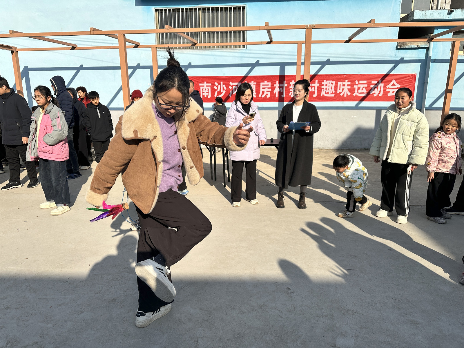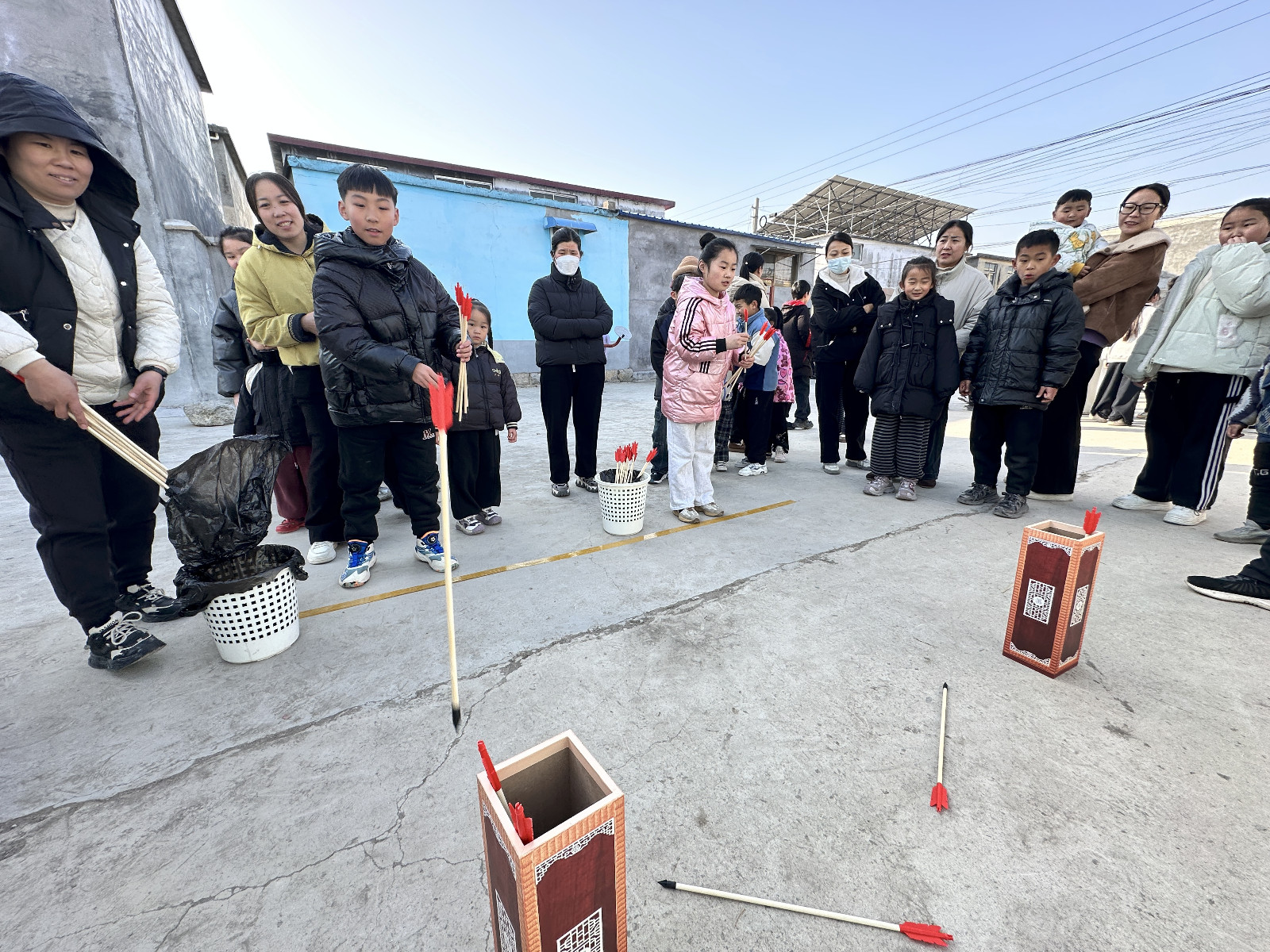 活动现场热闹非凡,精心设置的投壶、跳绳、踢毽子等趣味项目,兼顾了不同年龄段的参与需求。投壶区里,选手们排着队依次上阵,随着箭矢应声入壶的瞬间,人群中立刻爆发出阵阵欢呼。跳绳区更是活力满满,年轻人们双脚轻快跳跃,跳绳速度快得让人眼花缭乱。赛场边,围观的村民们化身热情的啦啦队,扯着嗓子为选手加油鼓劲,现场汇成了冬日里最温暖的乐章。