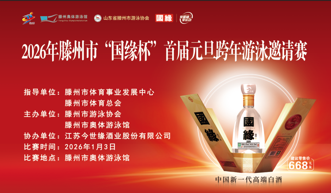 1月3日下午,2026年滕州市“国缘杯”首届元旦跨年游泳邀请赛在奥体游泳馆成功举办。来自全市的游泳爱好者齐聚一堂,以水为媒、以泳会友,在新年伊始上演了一场精彩绝伦的水上竞技盛宴,为冬日滕州注入了满满活力与热血激情。市体育发展中心党组成员、副主任,市体育总会秘书处秘书长杨水山,市体育总会秘书处办公室主任冯恩源,市体育事业发展中心产业科科长王吉玉,市游泳协会主席韩伟,江苏今世缘酒业股份有限公司、枣北办事处区域负责人王乐等出席开幕式。