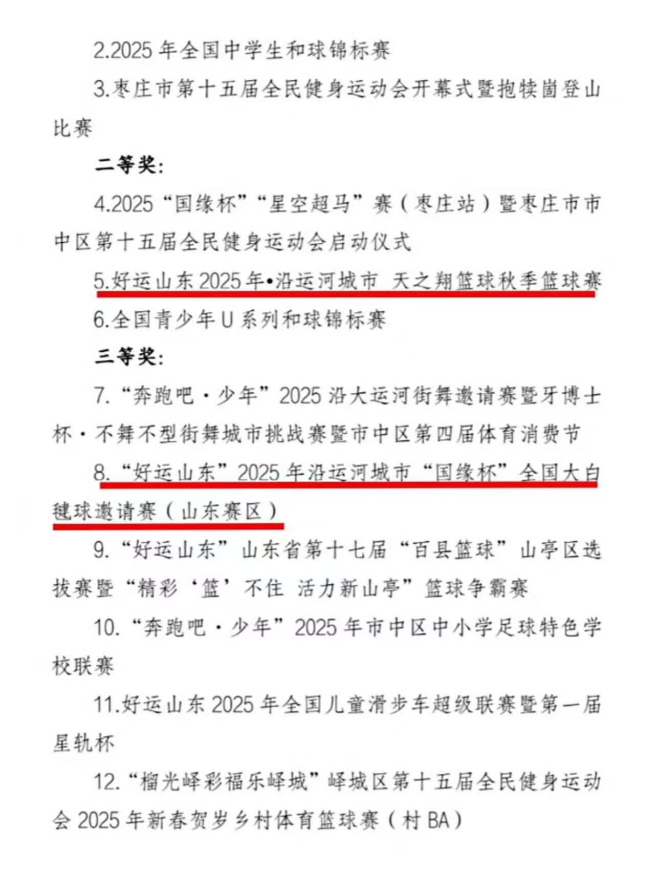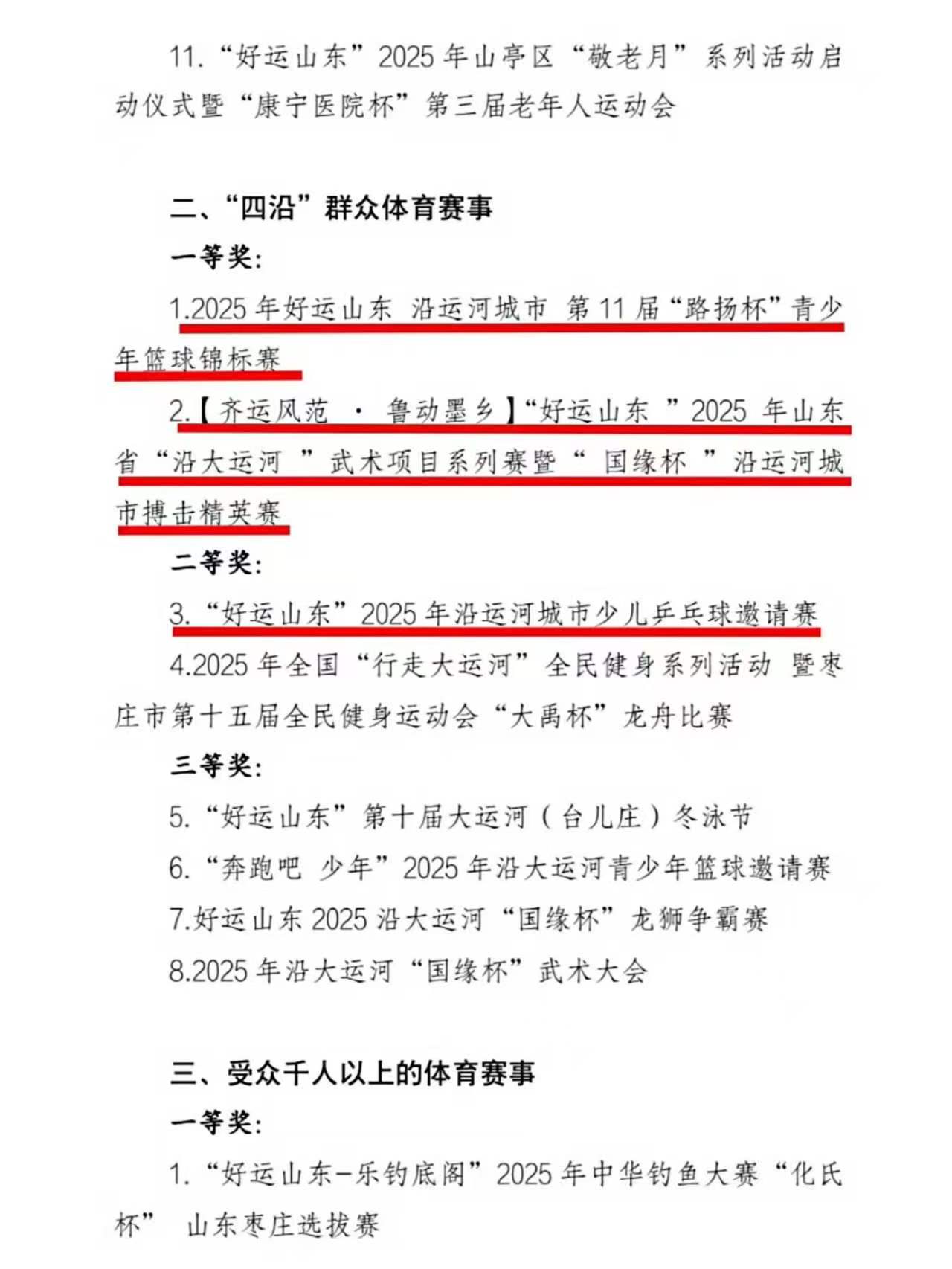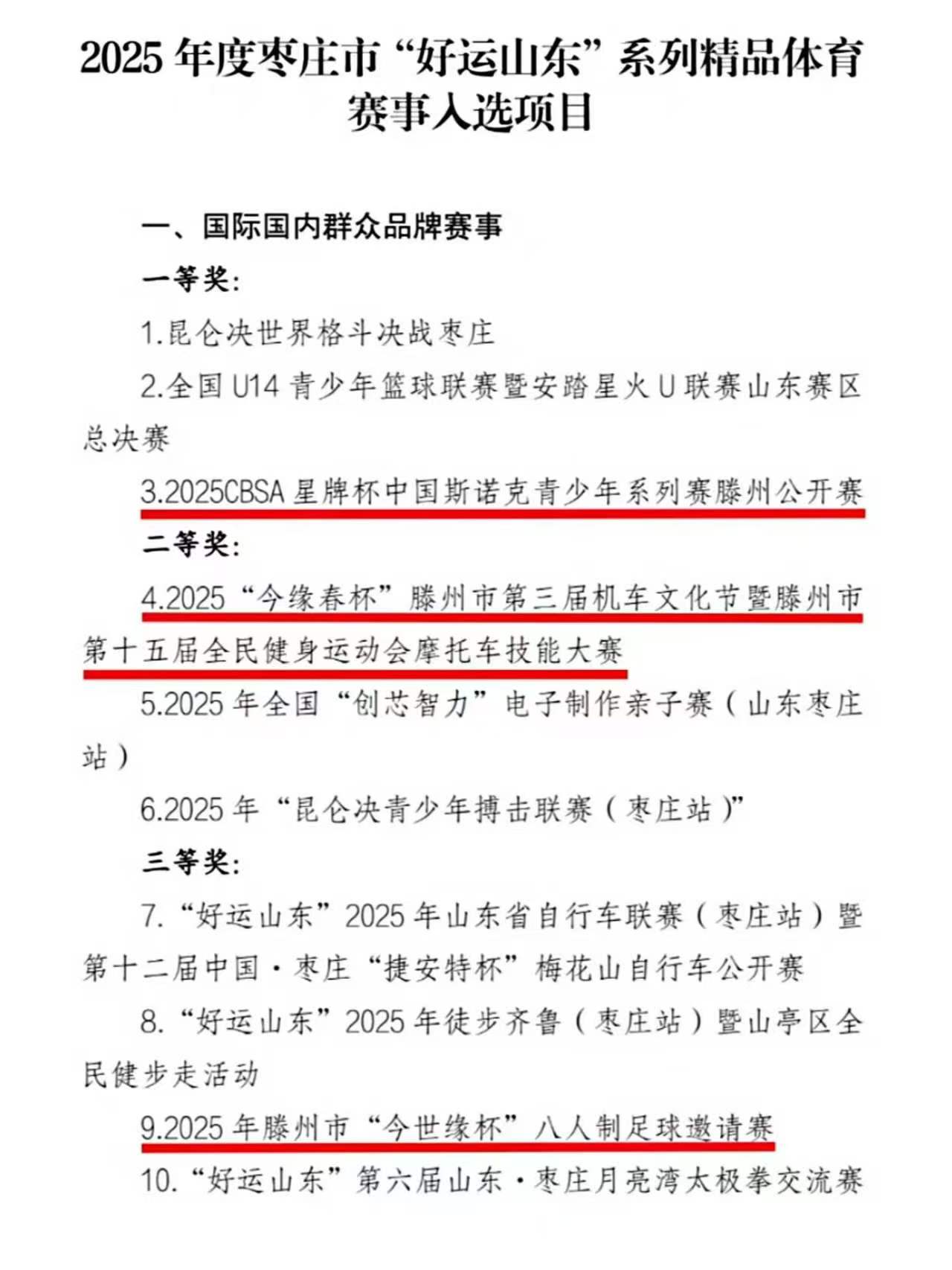 2025年,滕州市在枣庄市“好运山东”系列精品体育赛事评选中,共有八项赛事成功入选,累计荣获一等奖3项,二等奖3项,三等奖2项。下一步,我市将以此次获评市级精品赛事为契机,从服务经济社会发展大局、满足人民群众体育健身需求的高度出发,做实做优“体育+”文章,多谋划一批有分量、有影响、群众参与度高、社会宣传面广的体育活动,推动全市体育事业发展再迈新台阶、再上新水平,为加快建设“中华善城、现代滕州”贡献更多体育力量。