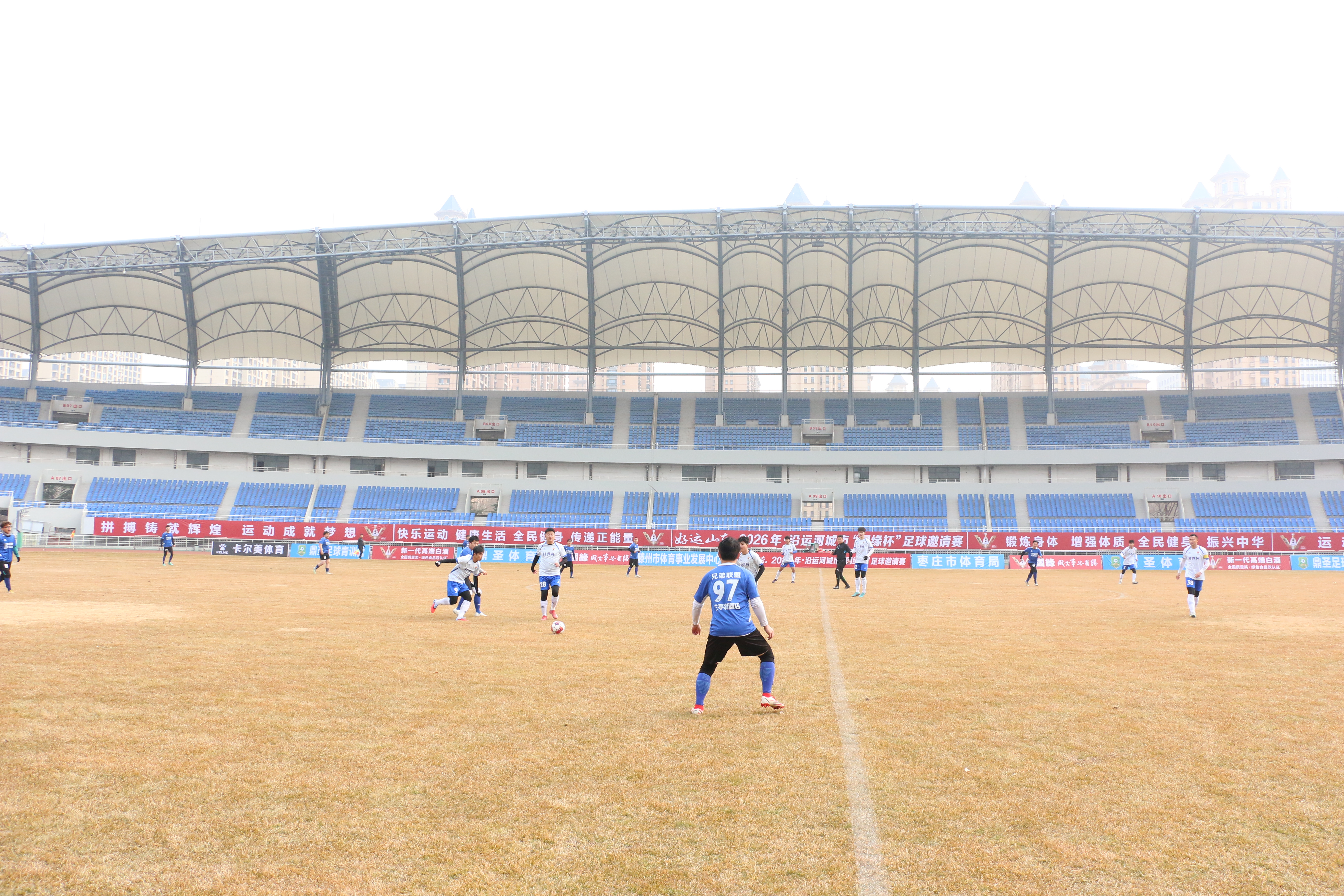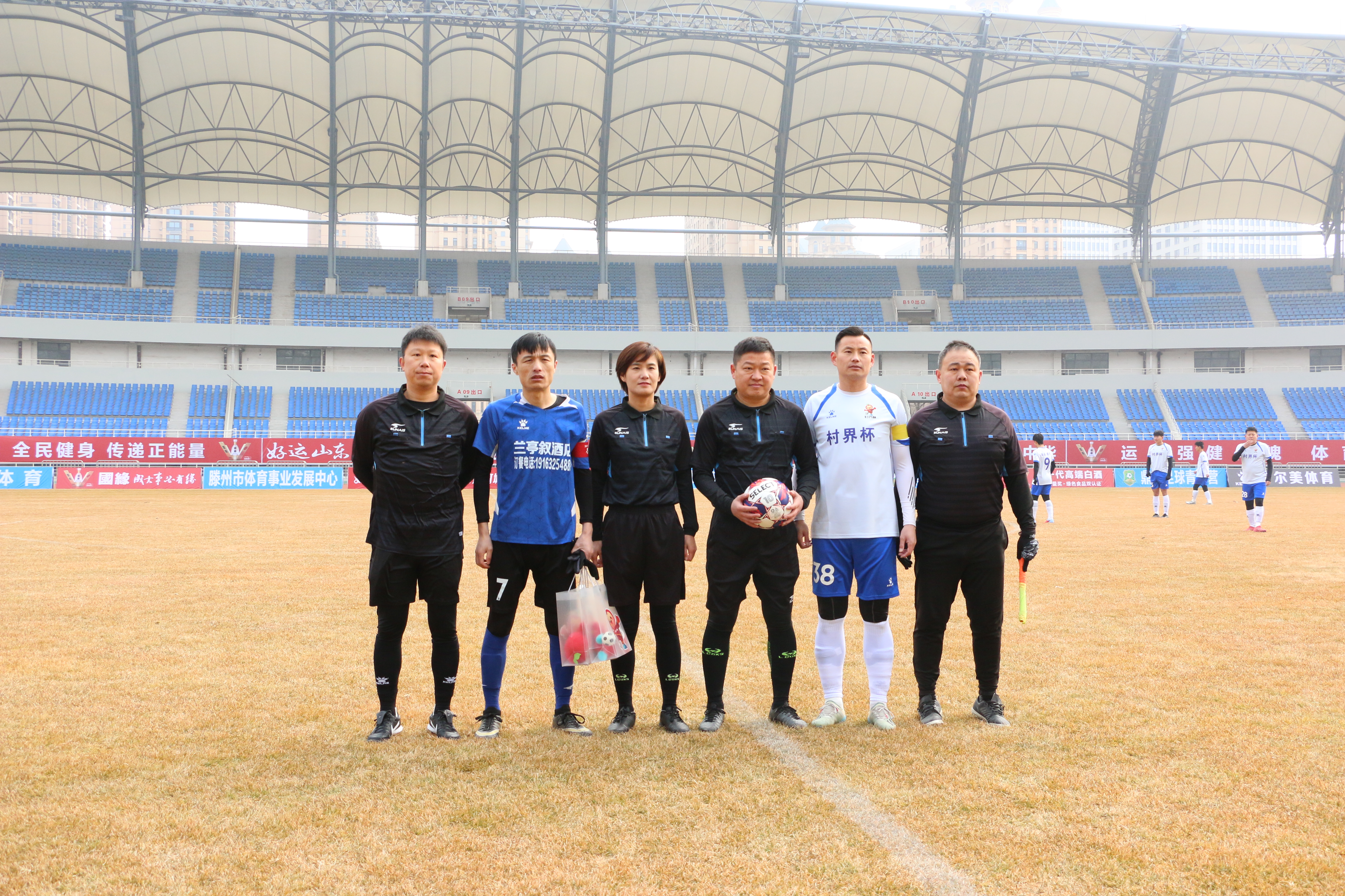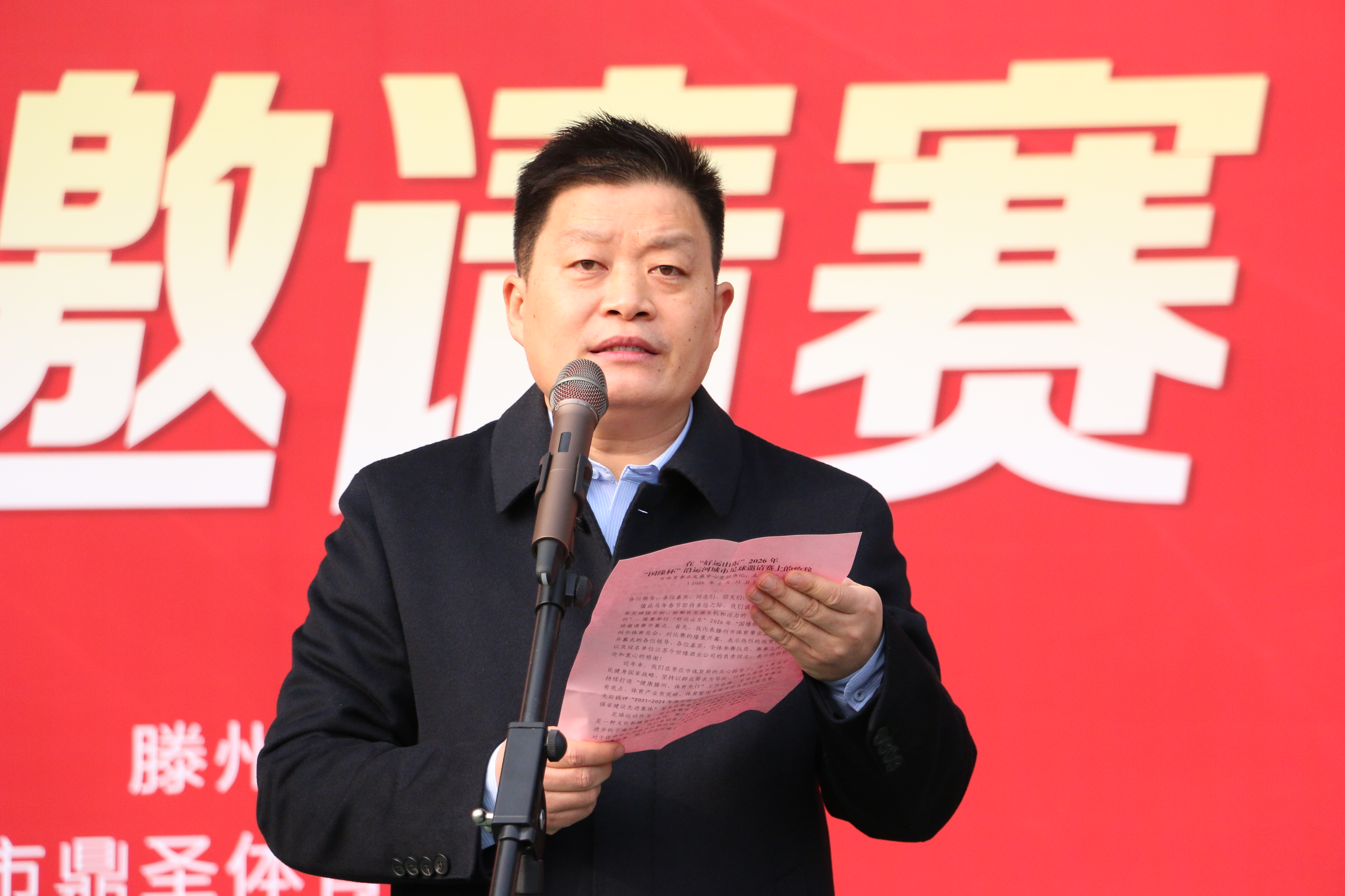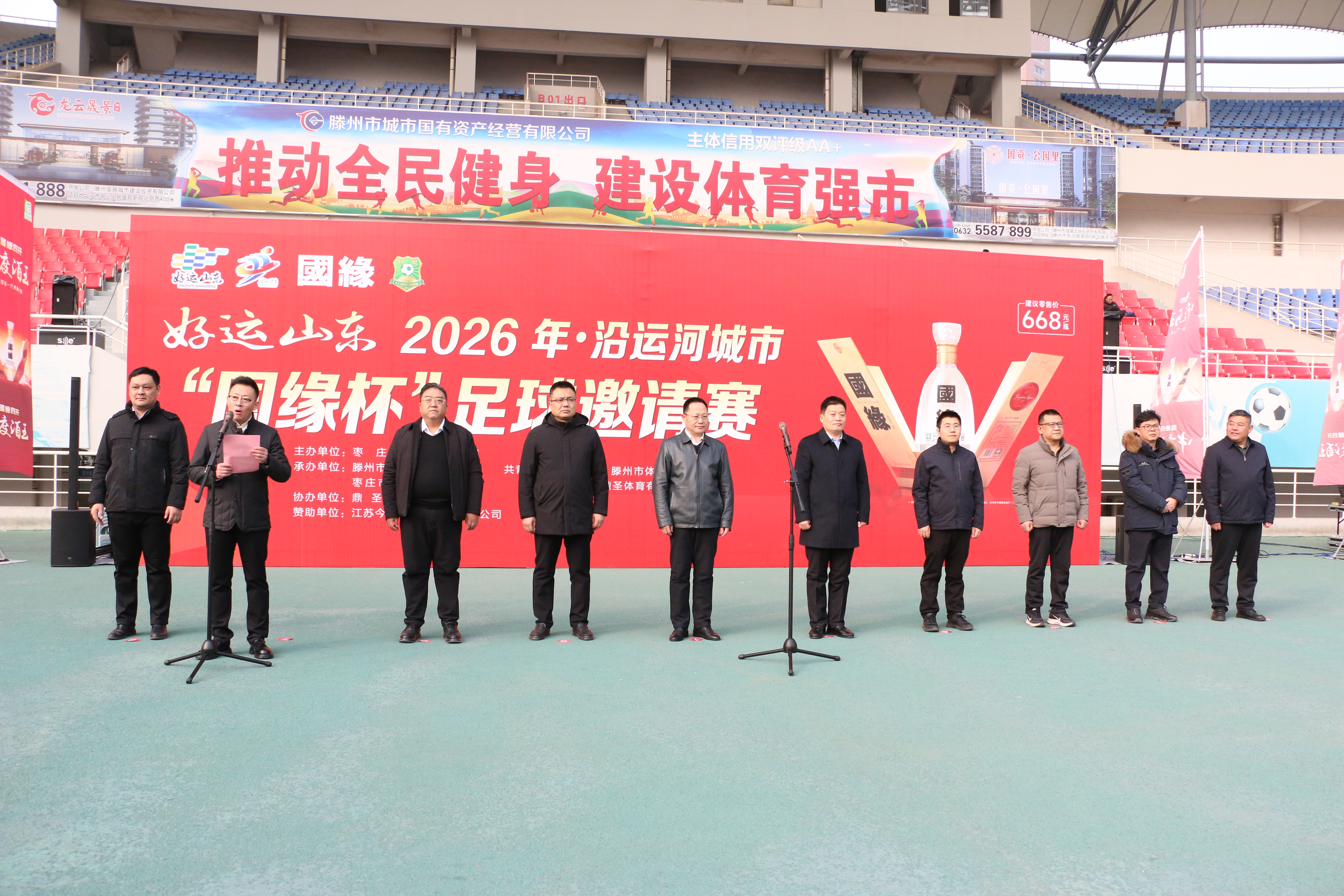 1月31日上午10时,滕州体育中心体育场气氛热烈、暖意融融,“好运山东”2026年・沿运河城市“国缘杯”足球邀请赛开幕式在此隆重举行。恰逢马年春节临近,来自沿运河城市的16支足球劲旅齐聚“中华善城、现代滕州”,共赴这场跨区域体育盛会。枣庄市体育局党组成员、副局长赵宇浩出席并宣布开幕,滕州市体育事业发展中心党组书记、主任丁涛致辞,枣庄市体育局体育经济和产业科负责人单洲先,共青团滕州市委副书记张恩铭,枣庄传媒集团、融媒发展有限公司总经理孙征,滕州市体育事业发展中心党组成员、副主任刘东,滕州市体育事业发展中心体育总会秘书处办公室主任冯恩源,滕州市体育事业发展中心体育产业科科长王吉玉,江苏今世缘酒业股份有限公司滕州办事处总经理王乐,枣庄市体育产业联合会副主席、枣庄市鼎圣体育总经理王磊等领导嘉宾出席仪式,与现场观众共同见证赛事启幕。