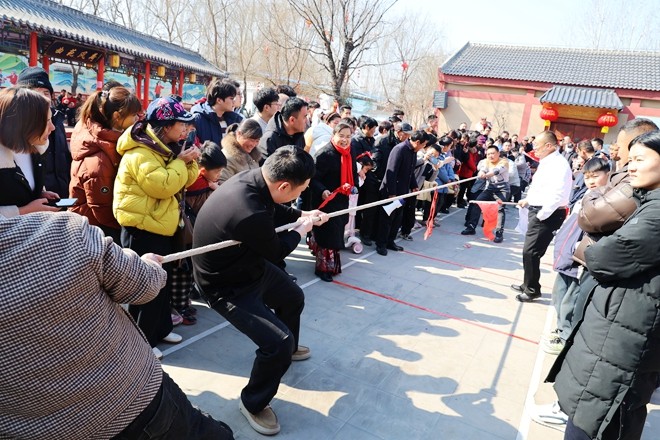 伴随着欢快的节奏,趣味运动会在广场舞《拜年》中拉开帷幕,舞者们身着节日盛装,舞姿优美,赢得现场阵阵掌声。随后,比赛正式开始,拔河比赛瞬间点燃全场热情,中青年选手们紧握长绳、脚蹬地面,全力以赴展开激烈比拼,大家咬紧牙关、奋力拼搏,场面十分热烈。除拔河外,蒙眼原地踏步走、广场舞等项目轮番上阵。比赛形式多样、精彩纷呈、笑点频出,将现场气氛一次次推向高潮。场外观众加油助威声不断,凳子旁、花池边站满了观赛群众,大家尽情享受春节喜庆与运动快乐。
