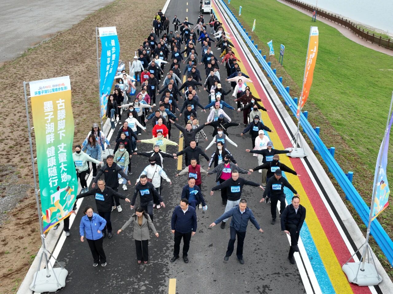 在热身运动后,全体参与人员精神抖擞、步履铿锵,沿着景致优美的环湖路正式开启5公里健步走。大家一路结伴而行、相互鼓劲,依次走过色彩靓丽的彩虹步道、视野开阔的观景台、功能完备的泄洪闸等点位,沿途欣赏碧波荡漾、绿意盎然的湖畔风光,切身感受环湖路建成后墨子湖焕然一新的生态美景,全程欢声笑语不断、昂扬斗志满满。行进途中,大家依次前往局工会、水发集团工会设置的完赛签到点完成签到,顺利领取活动纪念品,在轻松愉悦的氛围中圆满完成全程健步走。