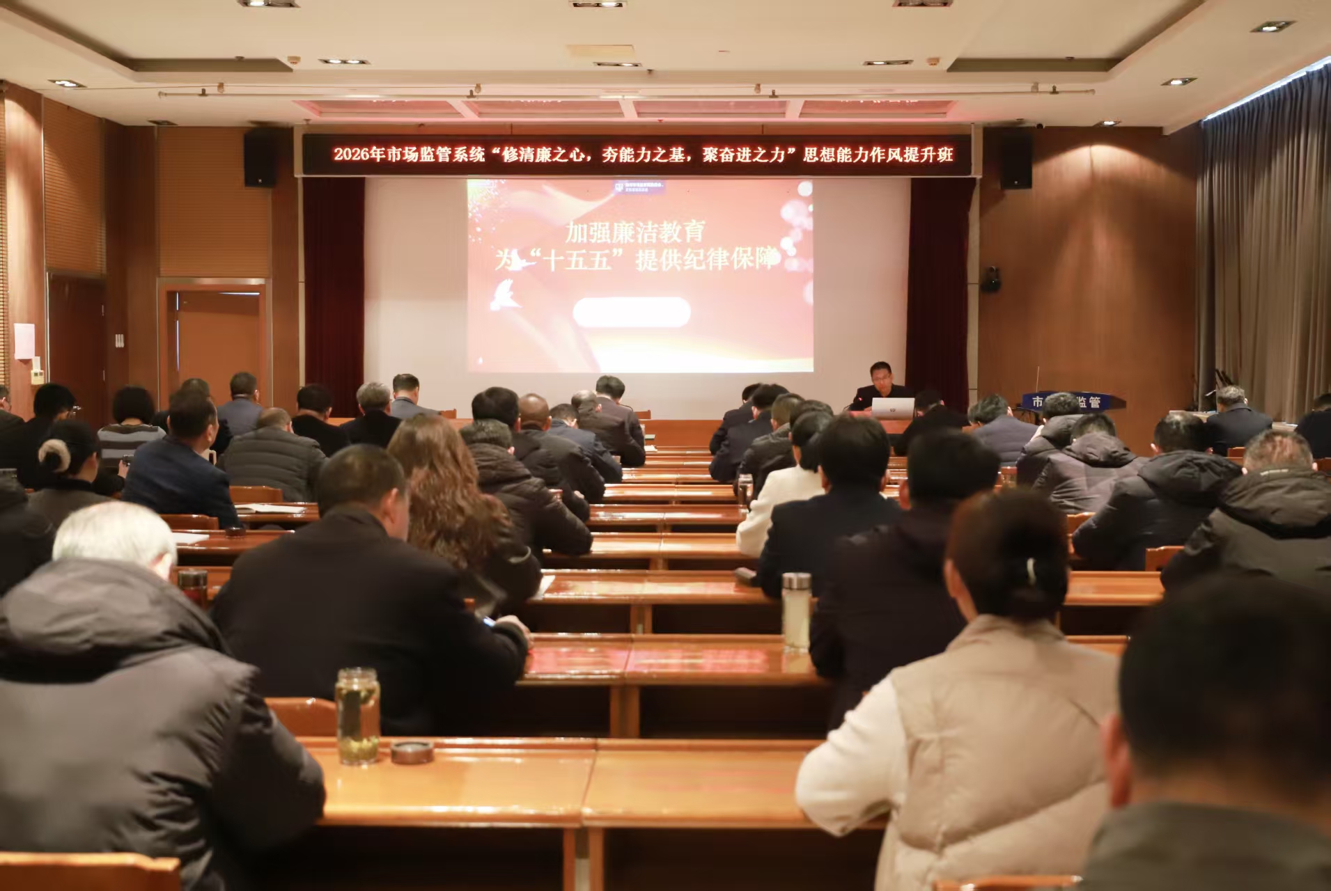 培训班分会场设在8008会议室,全体参会人员首先聆听了滕州市纪委监委案件审理室张永勤主任作的《加强廉洁教育,为“十五五”提供纪律保障》的精彩授课。随后,市市场监管局党组书记局长陈凡锋作开班动员讲话,为本次培训班提出了要求。
