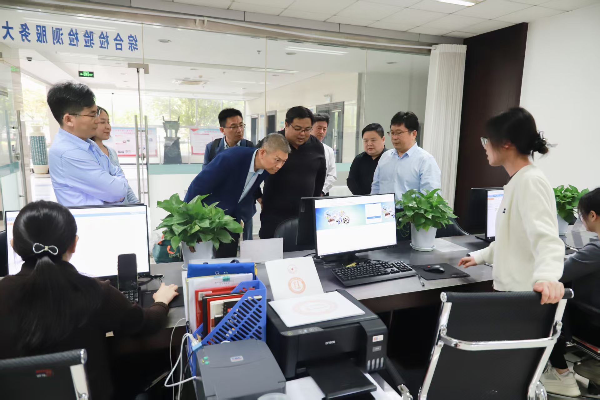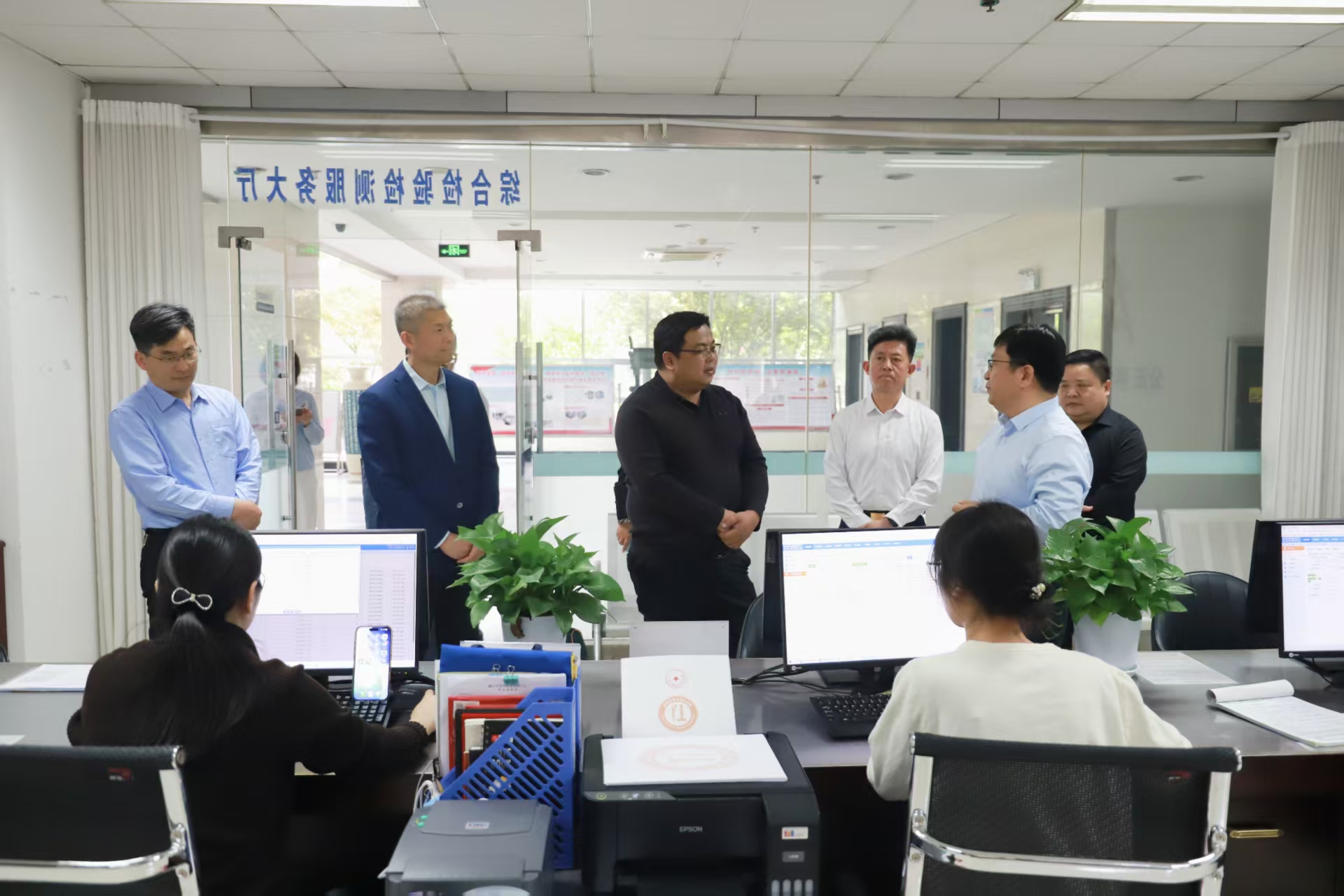 调研组首先来到中心综合业务大厅,实地查看平台运行情况,详细了解窗口设置、业务受理流程、线上线下服务衔接、资源整合调度等工作,现场察看检验检测、标准计量、认证认可、技术咨询等一站式服务开展成效,对平台“一窗受理、集成服务、资源共享、高效惠企”的运行模式给予肯定。