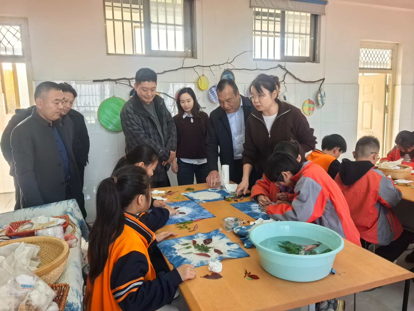 活动伊始,滕州市文化馆、鲍沟镇副镇长、鲍沟学区及郝寨小学相关负责人召开座谈会,就乡村学校文化教育需求与 “文艺进乡村” 活动常态化开展沟通。座谈结束后,培训课程开启,现场氛围热烈:书法课上,徐继腾老师从隶书基础笔法入手,通过示范讲解与一对一指导,帮助学生掌握握笔、运笔技巧,引导其感受汉字文化底蕴;扎染课上,教师演示折叠、捆扎、染色等工序,学生动手完成专属作品,尽显探索传统文化的热情。