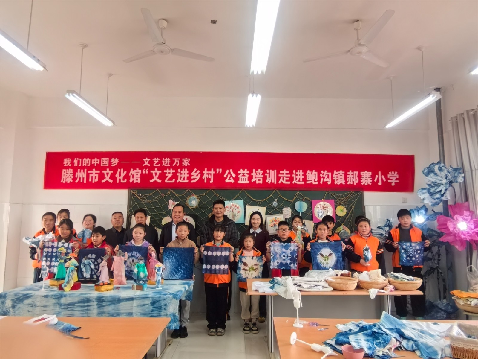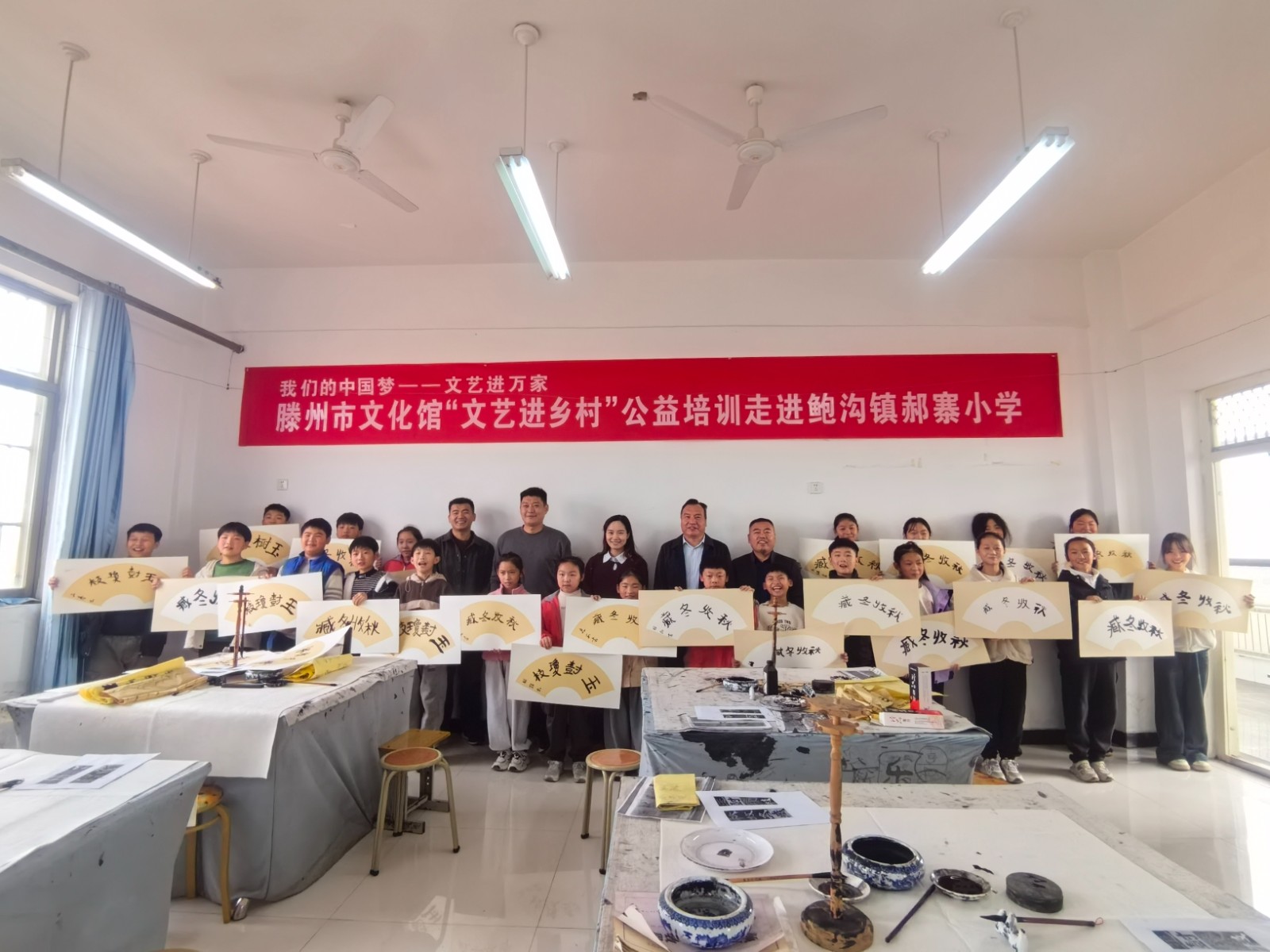 11月6日,滕州市文化馆 “文艺进乡村” 公益培训活动走进鲍沟镇郝寨小学。活动由文化馆馆长、书记张昆,副馆长、工会主席刘丽娜带队,特邀枣庄工程技师学院书法专业专职教师徐继腾授课,以书法、扎染两项传统艺术为载体,为乡村学子送上文化素养提升课,鲍沟镇副镇长朱茜全程陪同。