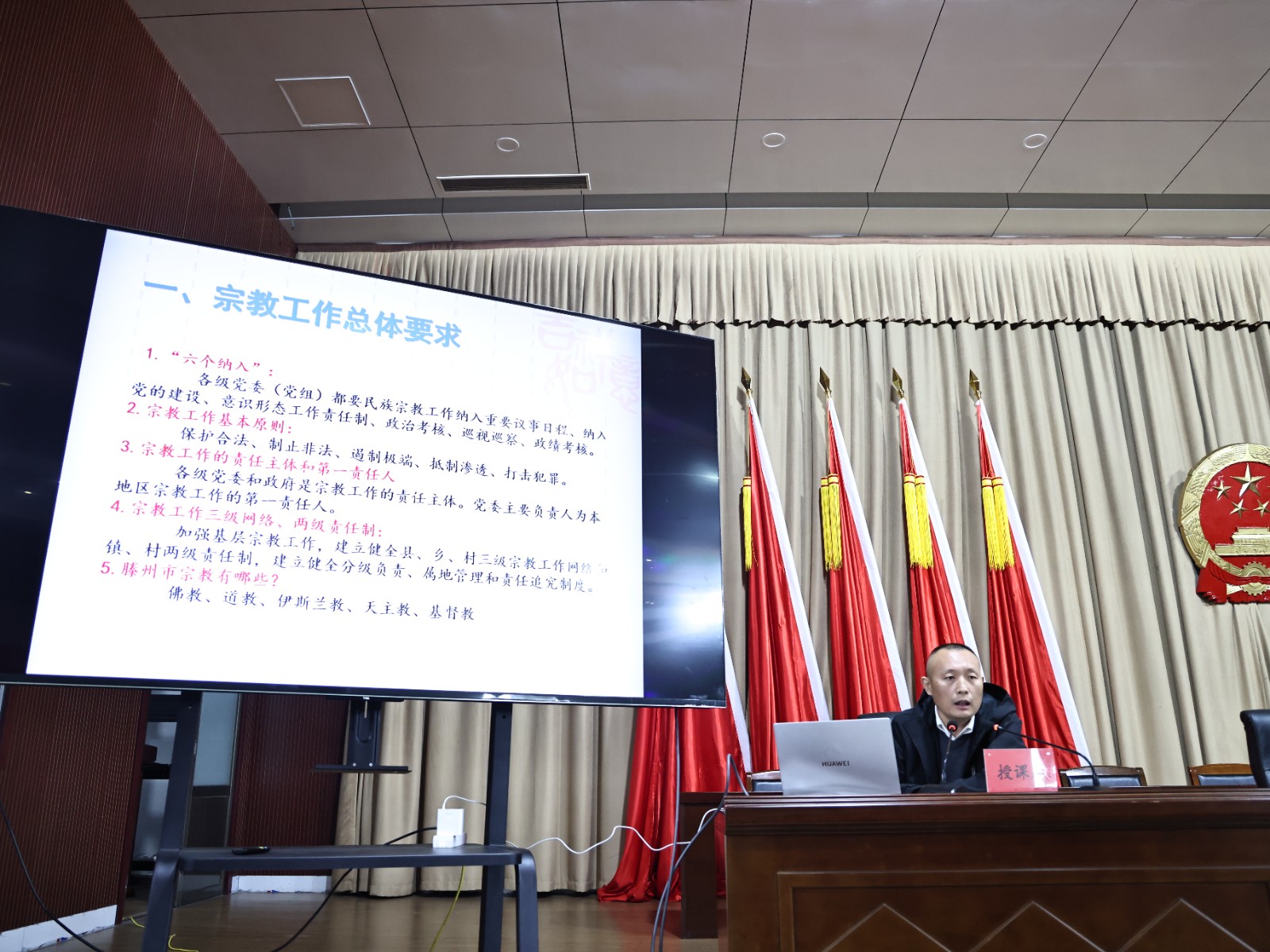 会上,党委委员、统战委员以“坚持宗教工作基本原则,筑牢宗教领域安全防线”为主题,明确了宗教工作关键要求、现存问题及后续任务。他指出,宗教工作需落实“六个纳入”和“保护合法、制止非法”等基本原则,健全县乡村三级网络与镇村两级责任制,遵循“九个必须”要求,党员严禁信仰宗教和封建迷信,同时区分宗教、封建迷信与邪教,规范民间信仰工作底线。滕州市主要涉及五大宗教。当前,宗教领域存在镇村干部认识不足、境外宗教渗透压力大、私设聚会点、教职人员素质不均、活动监管不力等问题。下一步将重点开展三方面工作:加强基层工作人员培训提升履职能力,强化隐患排查与风险处置,通过多渠道宣传增强群众对非法宗教活动的识别抵制能力。授课既有理论阐释,也有现实问题剖析,对基层宗教工作具有明确的指导意义,展现了领导干部的责任担当与政策水平。