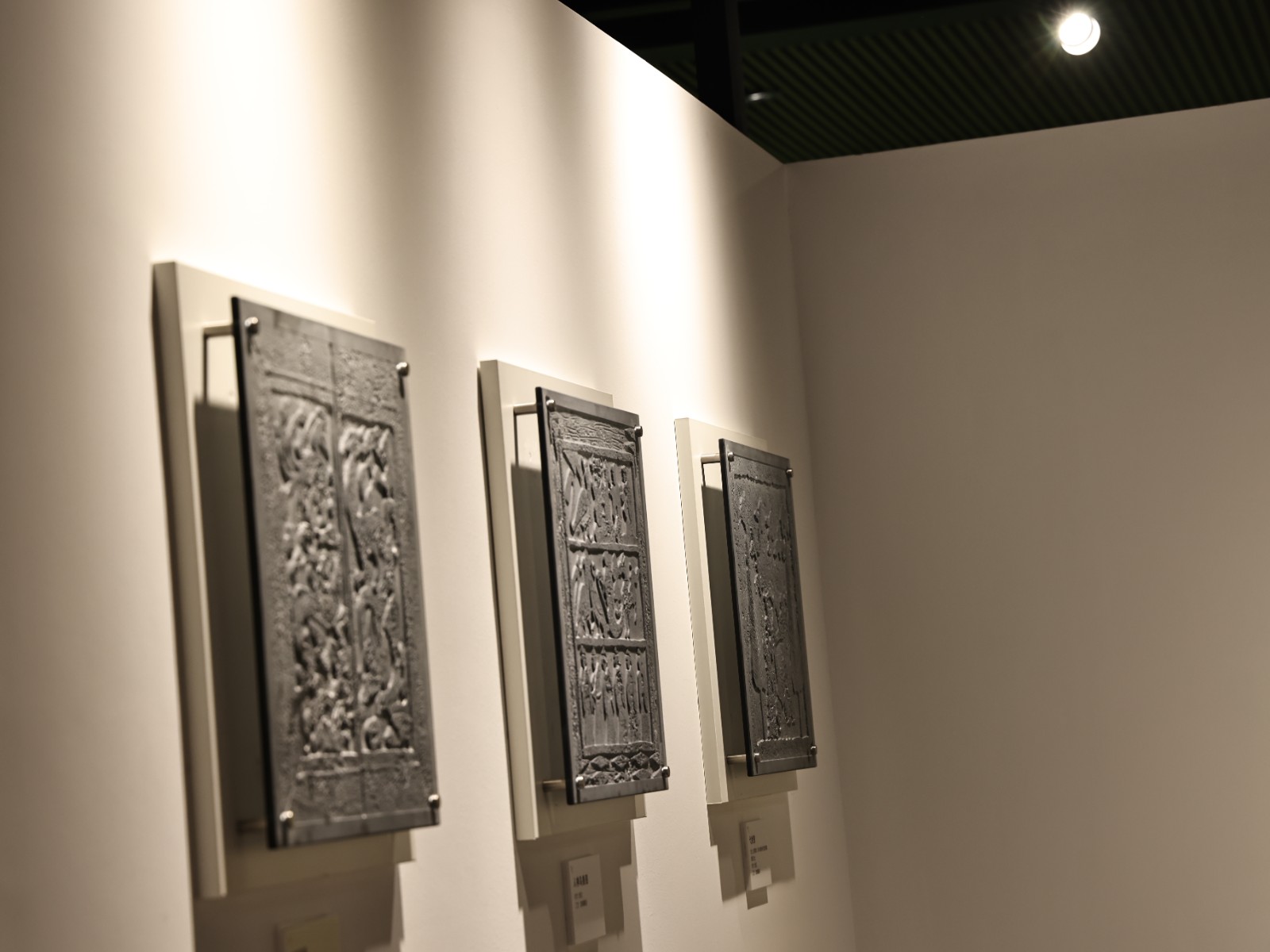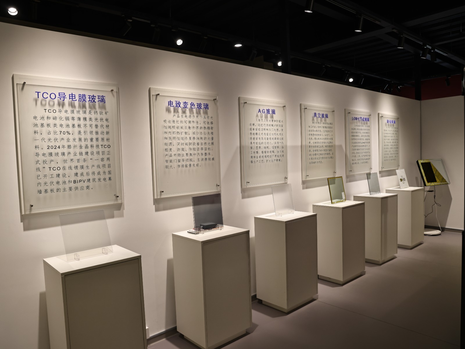 “善心”旁边,6 种具有产业特色的功能性玻璃熠熠生辉---玻璃制镜、Low-e 镀膜玻璃、真空玻璃、AG 防眩光玻璃、电致变色玻璃、TCO 导电镀膜玻璃,展示着滕州玻璃产业的技术创新与突破。还有6 幅玻璃画像砖令人叹为观止。它们以滕州汉画像石为灵感,通体玻璃打造,高度还原古画像砖的质感,生动再现西汉弋射、东汉四灵、汉代车马出行等历史场景。