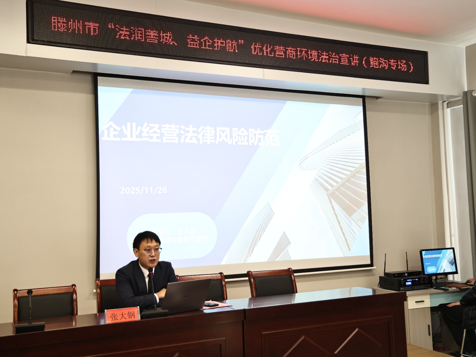 为深入优化营商环境,精准破解辖区玻璃企业发展中的法律风险与经营管理难题,11月26日,滕州市“法润善城、益企护航”优化营商环境法治宣讲走进鲍沟镇。市司法局党组成员、政治部主任王彦超,市公共法律服务中心主任霍永,中泰期货淄博分公司专家团队,山东科圣律师事务所专业律师,滕州市玻璃协会会长李正飞、鲍沟镇玻璃协会企业负责人参加活动,鲍沟镇党委副书记邱杰主持活动。