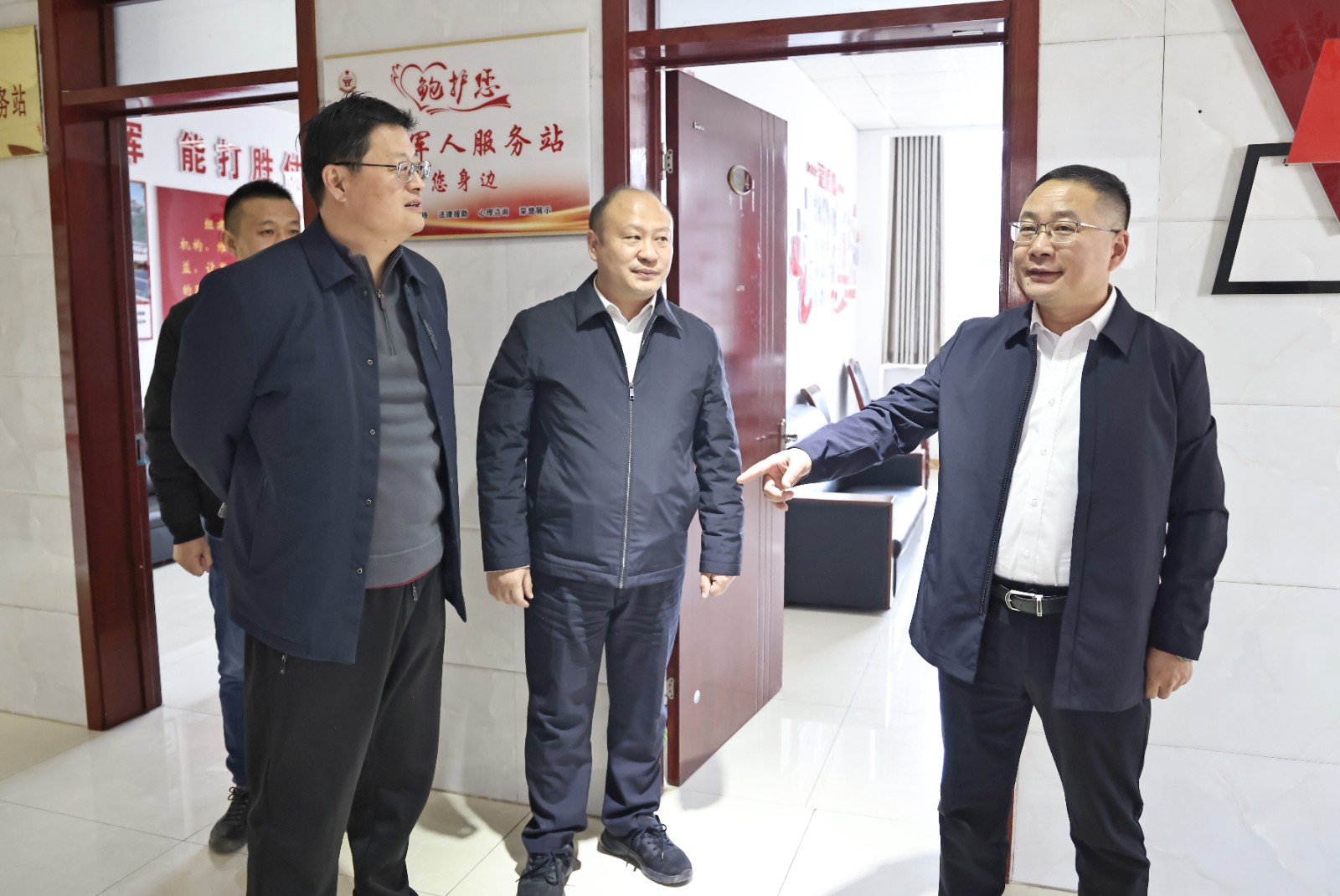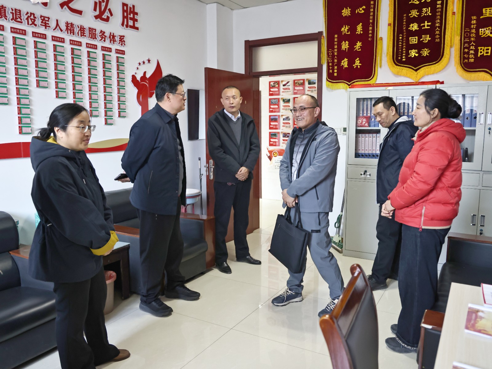11月28日,枣庄市退役军人服务中心主任杜红一行到鲍沟镇调研退役军人服务站工作开展情况,鲍沟镇党委书记梁刚,党委副书记、镇长刘金升,党委委员、统战委员陈庆等陪同了调研。
