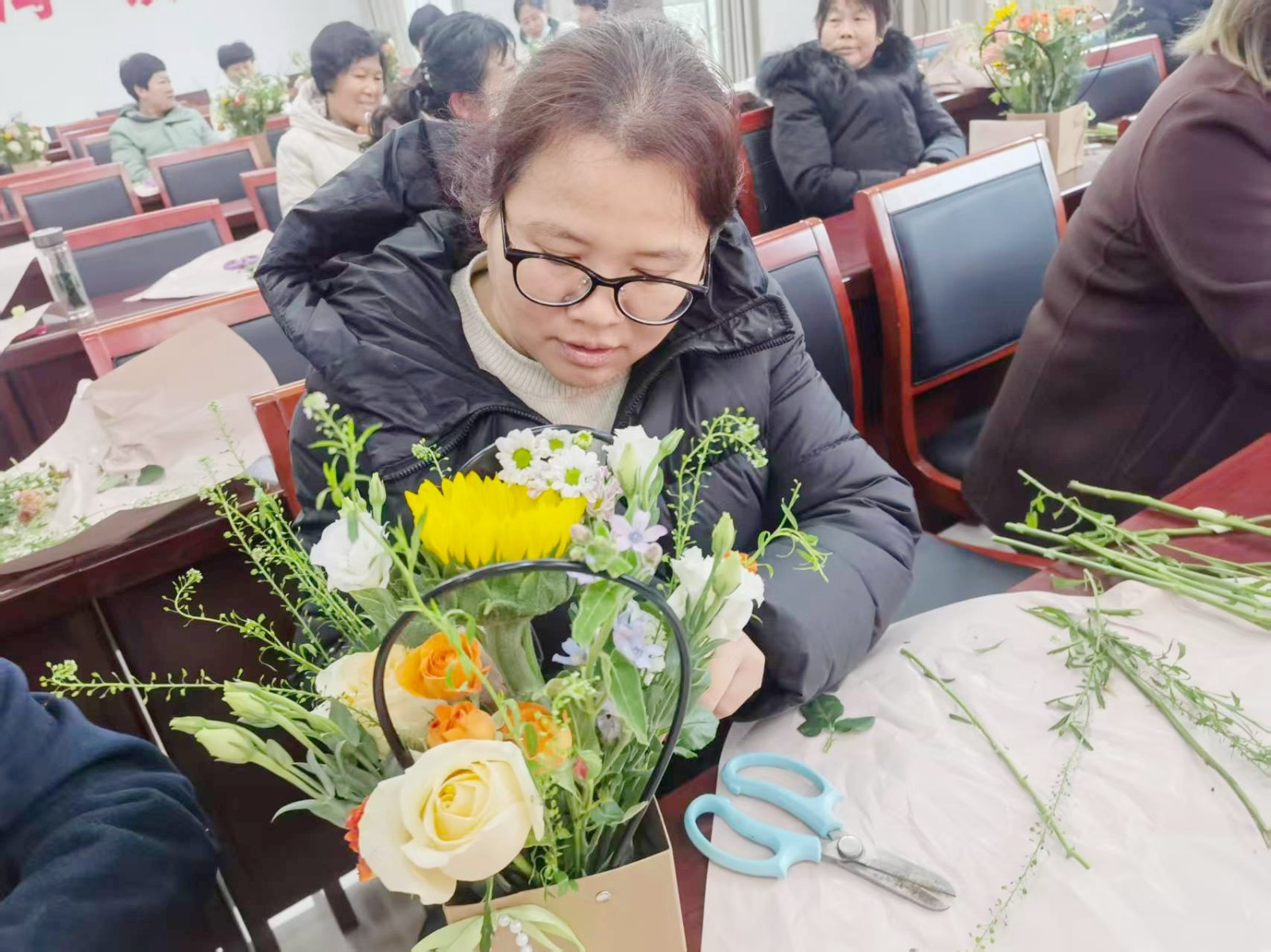 活动现场精心布置,暖意融融,不仅设置了花艺DIY等沉浸式体验环节,更特别邀请专业老师亲临现场,手把手耐心指导。花艺环节中,老师细致讲解花材搭配、修剪技巧与插花章法,姐妹们认真聆听、亲手搭配,在沉浸式创作中舒缓日常操劳的身心,交流创作心得、分享生活喜悦,每一件作品都承载着大家对生活的热爱,定格下属于自己的节日专属美好。