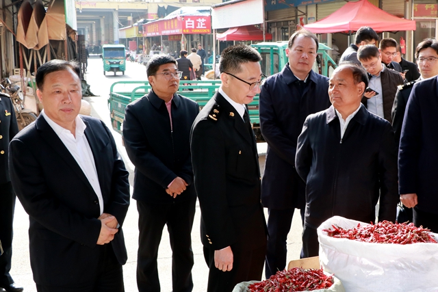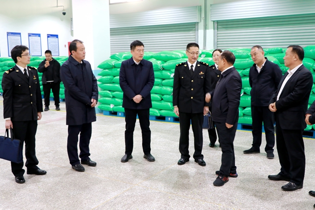 杨金涛一行来到嘉誉商贸城干杂海货市场和公共保税仓库,现场听取了相关负责同志关于嘉誉专业市场及保税仓库运行情况介绍,对干杂海货种类、市场交易、运营管理、保税仓库设计运行、仓库部署等情况有了充分的了解,对北辛街道香辛料产业发展给予高度评价。