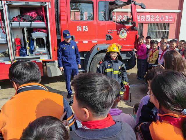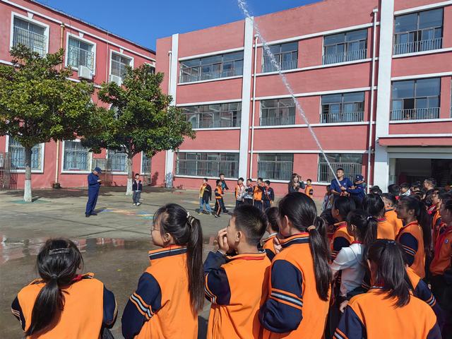 活动中,消防员结合校园场景,用通俗易懂的语言讲解火灾成因、初期火情处置、逃生路线选择等知识,重点示范灭火器“提、拔、握、压”使用步骤与湿毛巾捂鼻低姿逃生技巧。随后,消防员带领师生走进消防车,近距离参观救援工具。在展示消防喷水环节,让学生体会高水压带来的便利。
