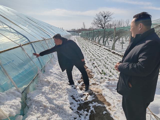 为强化管理指导,我镇组织农业技术人员成立专项服务小组,深入辖区各大棚种植基地,开展“一对一”技术指导服务。针对降雪后棚体承重、室内温度调控、病虫害防控等关键环节,技术人员现场示范指导种植户采取加固棚架、清除棚面积雪、覆盖保温膜、启用增温设备等措施,及时排查化解棚体坍塌、作物冻害等风险隐患。同时,提醒种植户合理安排灌溉、施肥,密切关注作物生长情况,对受轻微冻害的作物及时采取补救措施,力争将损失降到最低,全力守护好群众的“菜篮子”“钱袋子”。