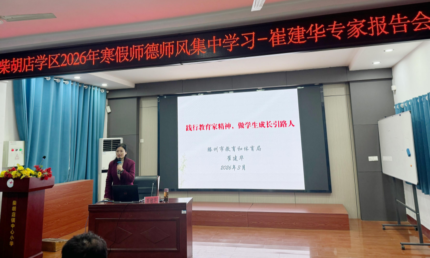 为深化新时代师德师风建设,引导全体教师坚守育人初心、勇担教育使命,3月1日下午,柴胡店学区2026年寒假师德师风集中学习专家报告会在中心小学顺利举办。市教体局思政科崔建华科长应邀作专题报告,以“践行教育家精神,做学生成长引路人”为核心主题开展讲座,柴胡店镇学区全体人员及各中小学、幼儿园在职在岗180余人教师参会学习。