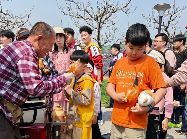 在本届梨花节现场,民俗展演、非遗展示、亲子互动等活动轮番上演,吹糖人、面塑等非遗传承人现场献艺,吸引游客驻足观看、参与体验;枣庄优品展销区里,梨膏、梨汁、梨干等深加工产品琳琅满目,运河大集里还有村民自家种植的蔬菜、养殖的家禽等土特产品同步亮相,现场交易火爆。“每年梨花节我都会来,既能赏梨花,又能买到正宗的梨膏,还能体验民俗活动,特别有意义。”来自城区的游客戴女士笑着说道。