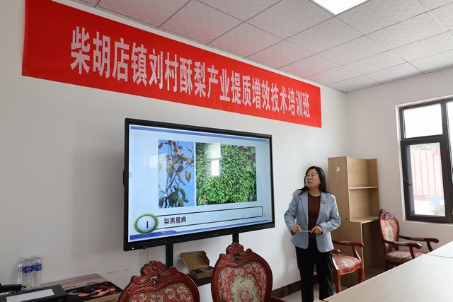 柴胡店镇党委副书记、镇长方梅详细介绍了当地刘村酥梨产业的发展现状、规模布局、品牌建设情况,以及当前产业发展中在栽培管理、品质提升、病害防控等方面存在的技术需求,为专家精准指导指明了方向。