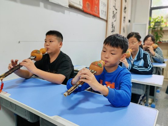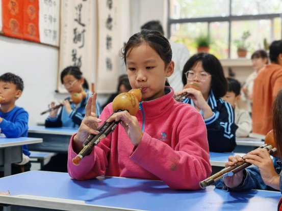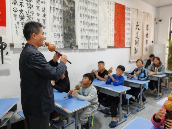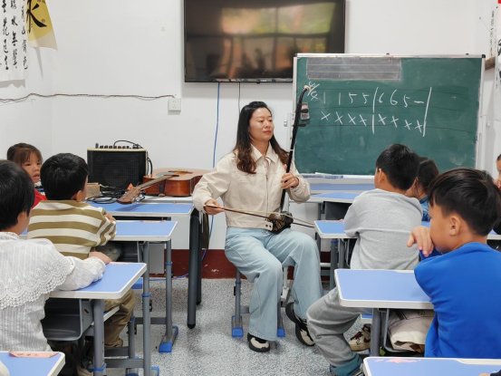 捐赠仪式结束后,志愿者老师为孩子们带来了一堂精彩生动的“华彩音乐大讲堂”公益音乐课,倾心讲解吉他、二胡的演奏方法和基本乐理知识,重点开展了葫芦丝公益课程。课程中,老师从葫芦丝的起源、构造讲起,手把手教大家持握姿势、用气方法和基础指法,孩子们从最初吹奏出断断续续的音符,到逐渐能连贯吹出简单旋律,成就感溢于言表。老师们针对孩子们在练习中存在的薄弱点进行手把手指导,耐心解答孩子们的疑问,现场学习氛围热烈。