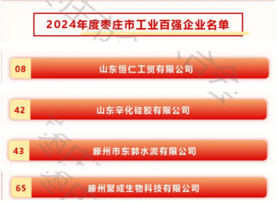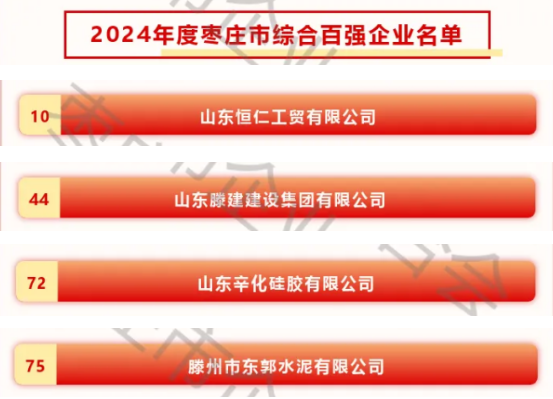 11月1日,在2025枣庄企业家日暨产学研合作大会上,枣庄市工信局、枣庄市企业联合会发布了2024年度枣庄市综合百强企业和工业百强企业名单。我镇山东恒仁工贸有限公司、山东滕建建设集团有限公司、山东辛化硅胶有限公司、滕州市东郭水泥有限公司入选综合百强企业;山东恒仁工贸有限公司、山东辛化硅胶有限公司、滕州市东郭水泥有限公司、滕州聚成生物科技有限公司入选工业百强企业。山东恒仁工贸有限公司、山东辛化硅胶有限公司、滕州市东郭水泥有限公司入选“综合”“工业”双百强企业!