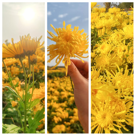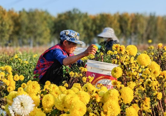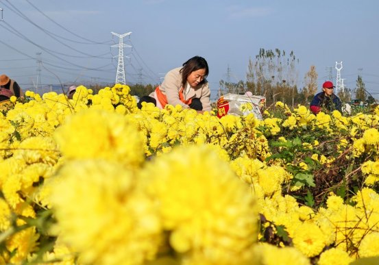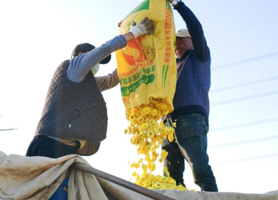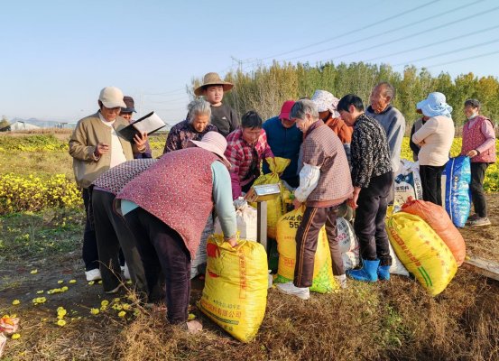 花丛间,70余名村民俯身忙碌,指尖轻捻便将饱满菊瓣收入桶中,娴熟的动作间满是喜悦。“我每天能摘150多斤,按天结算,在家门口挣钱真方便!关键天天看着这些花心情都好。” 杨庄村村民王大姐边采摘边笑着说。据基地现场负责人范明芳介绍,当前正值采摘旺季,每日需雇佣周边村民70余人进行采摘。