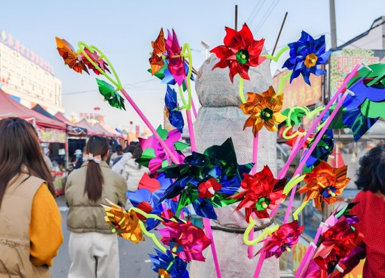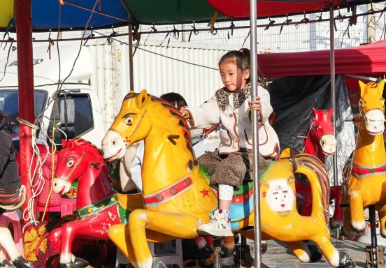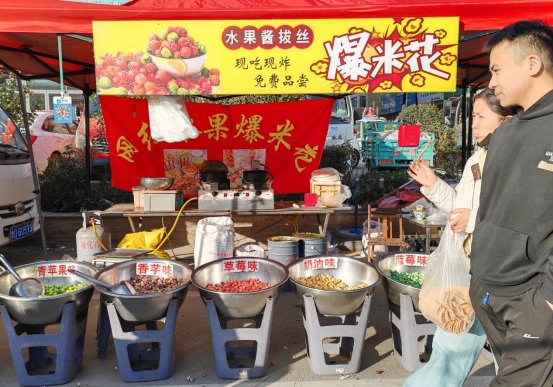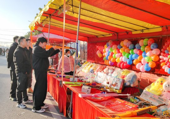 娱乐活动更添浓厚氛围。蹦床、旋转木马等现代游乐设施前,小朋友排起长队,欢声笑语穿透人群。套圈、打气球等传统游艺项目也备受青睐,大人小孩齐上阵,喝彩声与欢呼声交织在一起,为古会注入了鲜活气息。