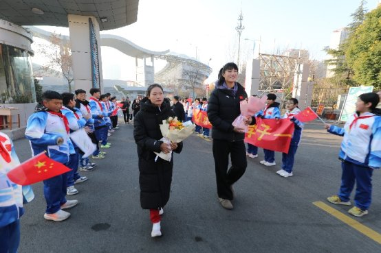 欢迎仪式上气氛热烈,体校学子手持“热烈欢迎体校优秀学子”“努力培育竞技体育人才,为滕州争光为山东添彩”等标语,热烈欢迎冠军的到来。徐蕾深受感动,微笑挥手回应,现场温情洋溢。