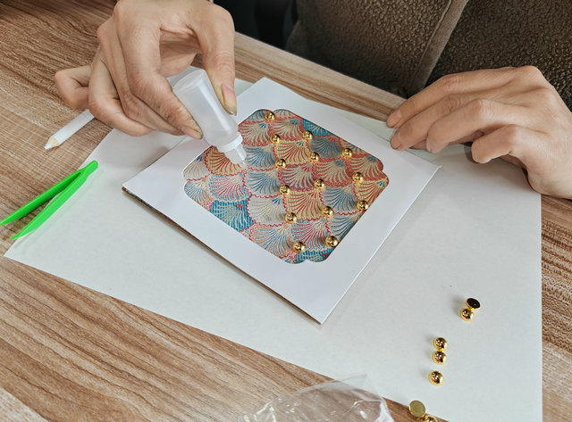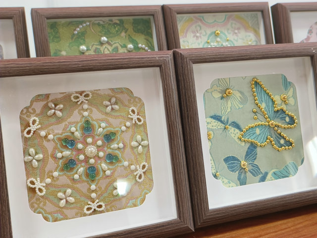 活动现场气氛热烈,桌上整齐摆放着宋锦布料、莹润珍珠、专用胶水、镊子及实木画框等材料。在专业老师的细心讲解下,大家认真铺设宋锦底布,用心设计图案布局,小心翼翼地将珍珠点缀在恰当位置,每一步都凝聚着专注与耐心。经过粘贴、固定、装裱等多道工序,一幅幅独具匠心的宋锦珍珠画逐渐成型。