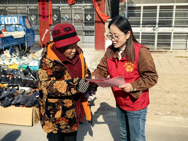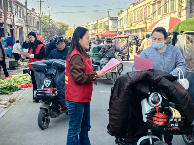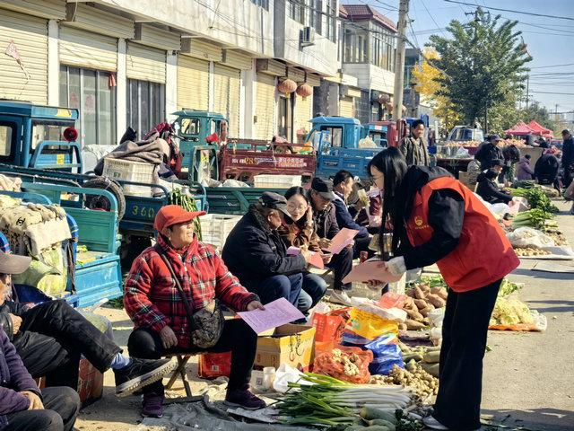 琳琅的货摊间,志愿者们鲜红的马甲穿梭其中显得格外瞩目。大家或是热情地向过往群众递上移风易俗倡议书,推广勤俭节约、杜绝浪费的传统美德,或是详细地为摊贩、店主讲解婚事新办、孝亲敬老的生活新理念。从集市入口到摊位角落,“红马甲”的身影无处不在,将将文明理念,在轻松氛围与细致沟通中悄然传递。