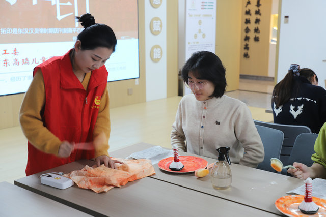 活动现场暖意融融,市义工协会老师现场专业指导,志愿者提前备齐宣纸、墨汁、拓包,以及刻有马年吉祥纹样、福字等喜庆图案的拓印模板。活动中,志愿者细致讲解拓印技艺的历史渊源,手把手示范铺纸、蘸墨、轻拍等关键步骤,着重强调“轻、匀、稳”的实操技巧,助力大学生快速掌握要领。