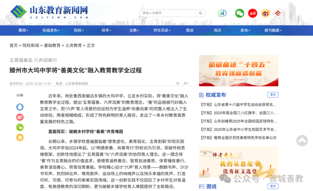 12月24日,《山东教育新闻网》刊发《滕州市大坞中学将“善美文化”融入教育教学全过程》,推介大坞中学立足乡村实际、深耕“善美文化”、探索特色发展路径的创新实践与育人成效。