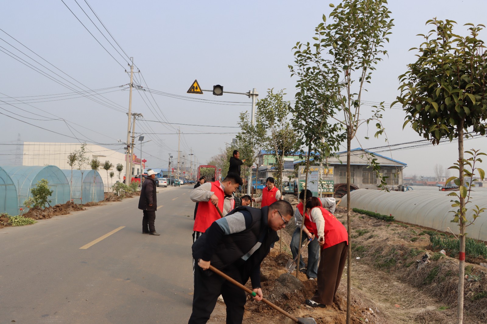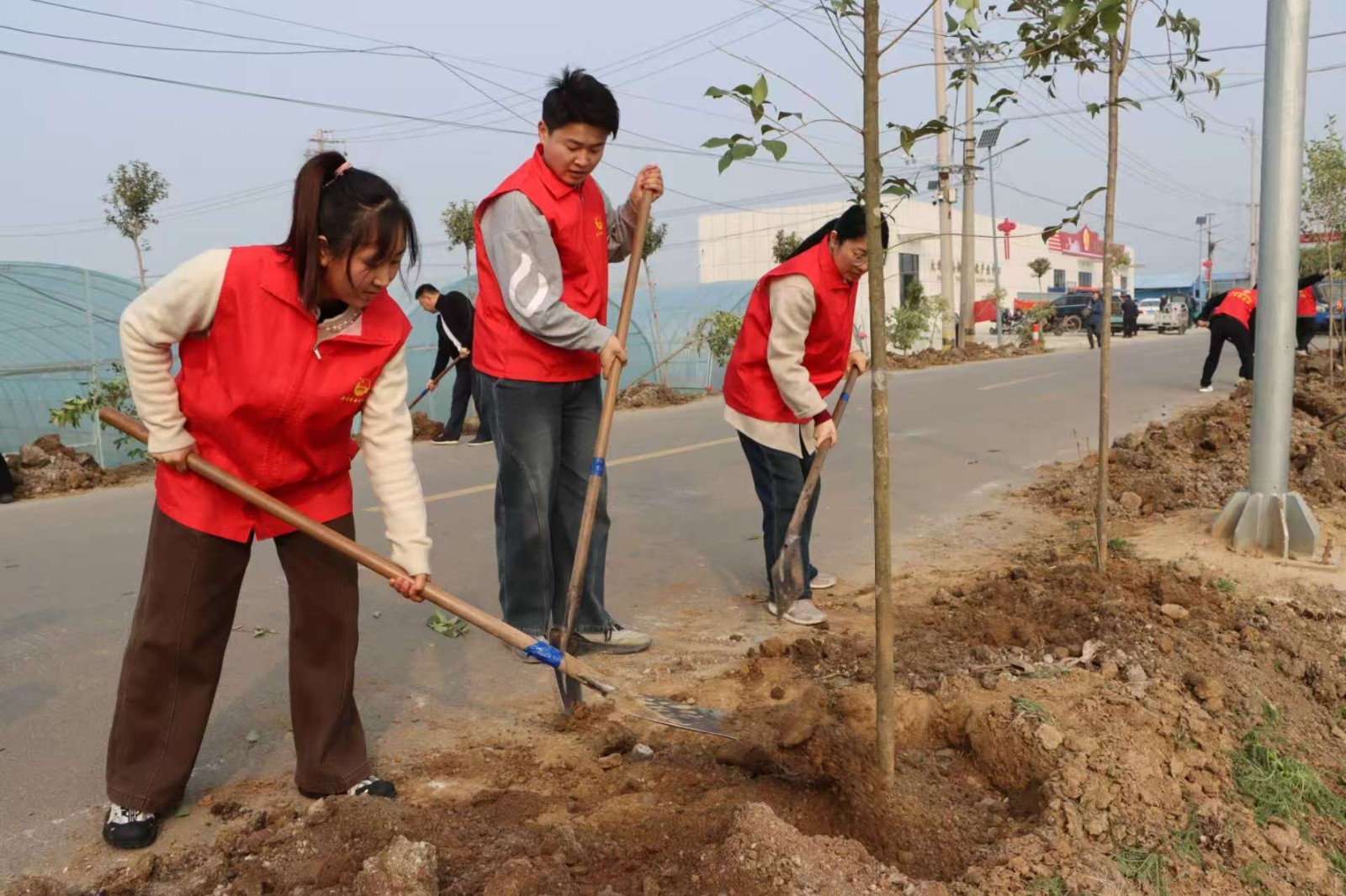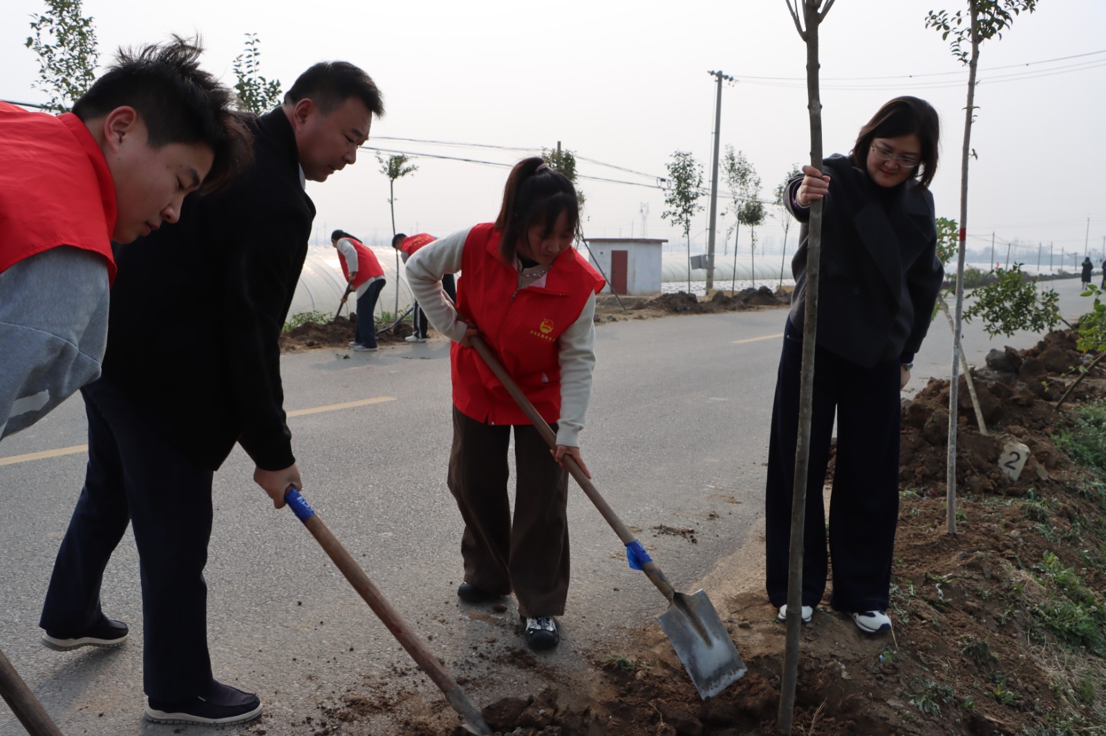 随后,参与人员两两一组、分工协作,挥锹铲土、填坑扶苗、浇水定根,每道环节细致严谨、有条不紊。红色志愿身影穿梭其间,欢声笑语与劳动号子交织,一派热火朝天的生动景象。经过数小时奋战,一排排新栽苗木迎风挺立,为初春的大坞增添了蓬勃生机,此次活动共栽植乡土苗木千余株。