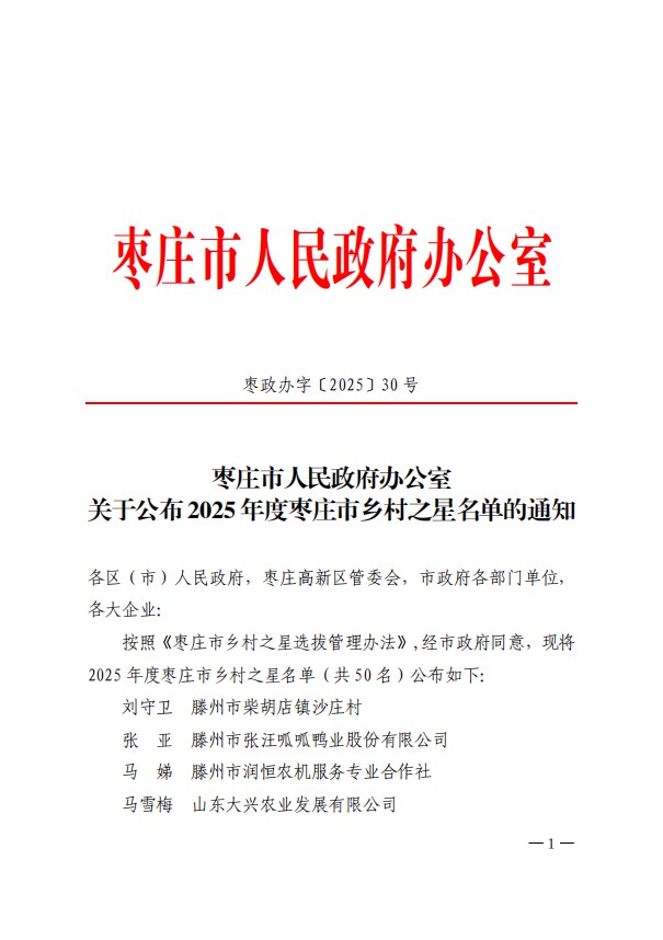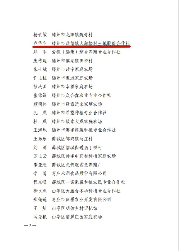 近日,枣庄市人民政府办公室公布了2025 年度枣庄市乡村之星名单,其中滕州市洪绪镇大颜楼村土地股份合作社领办人乔传冬获评2025年度“枣庄市乡村之星”。