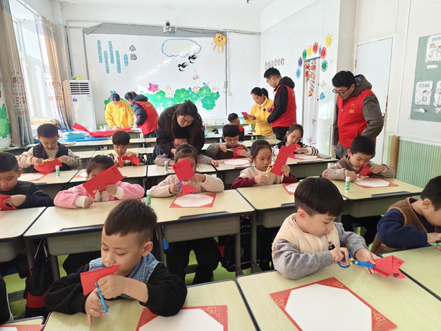 活动现场,非遗传承人管老师用生动语言向孩子们讲解剪纸的历史渊源与技艺特点,展示精美作品,激发孩子们对传统文化的兴趣。在老师和社区志愿者的指导下,孩子们认真折叠红纸,小心裁剪,创作出小兔子、窗花、蝴蝶等充满童趣的剪纸作品。活动现场气氛活跃,孩子们在动手实践中感受到非遗艺术的独特魅力。