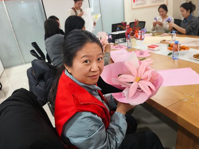 随后进行扭扭棒花束制作。专业老师讲解步骤并示范,居民们边学边做,五颜六色的扭扭棒在指尖穿梭,逐渐变成栩栩如生的百合花。大家互相交流技巧,现场温馨热烈。制作完成后,大家用包装纸将花束包好,一束束作品饱含心意与创意。