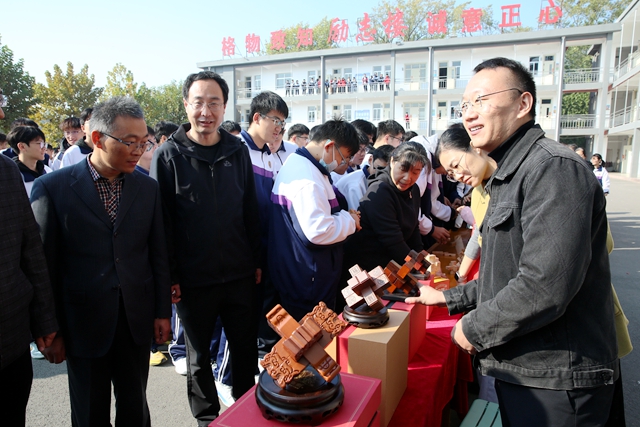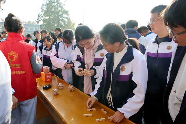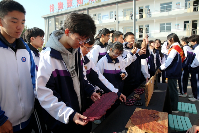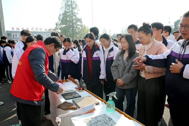 活动现场设五大特色展区,让学生沉浸式感受非遗魅力。鲁班锁展区内,传承人李浩展示多样鲁班锁,讲解榫卯原理与古今应用,学生们动手尝试组装;斗拱展区中,王海军通过实体模型,解析斗拱在古建筑中的结构、力学价值与等级象征,引导学生观察思考;拓印互动区里,刘子宝演示上纸、捶拓、上墨、揭纸全流程,学生们亲手制作拓印作品,体验传统技艺;木雕艺术区中,李晨陈列雅木木雕作品与工序半成品,介绍工艺流程与地域特色,让学生直观感受木雕美学。同时,朝臣庄户剧团的老师们带来柳琴展示与柳琴戏小段演出,悠扬曲调赢得阵阵掌声。