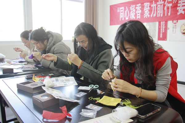 在老师的悉心指导下,职工们迅速投入创作。大家领取材料包和制作工具后,纷纷化身“手艺人”,穿针、引线、打结、填充,有条不紊地进行操作。过程中,大家相互交流心得、互帮互助,遇到难题及时向老师请教,现场气氛热烈而温馨。不一会儿,经过大家的巧思与巧手,逐渐变成了一个个造型精致、香气怡人的宋锦香囊。