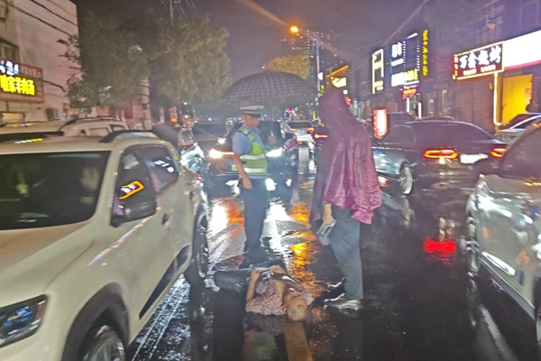 9月18日晚,辖区遭遇降雨天气,龙泉街道交警四中队夜班巡逻人员坚守岗位,在辖区内开展道路安全巡查工作,当巡逻至塔寺路聚龙酒店路段时,巡查人员敏锐发现一名中年男子醉酒后躺卧在马路中央。此时降雨持续,过往车辆刹车距离增加、视线受阻,该男子毫无防护地处于车流中,随时面临被撞击的危险。