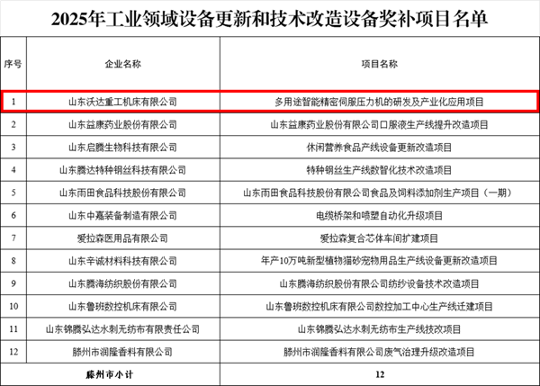 近日,枣庄市工信局公示了2025年工业领域设备更新和技术改造设备奖补项目名单。龙泉街道企业山东沃达重工机床有限公司多用途智能精密伺服压力机的研发及产业化应用项目成功入选。